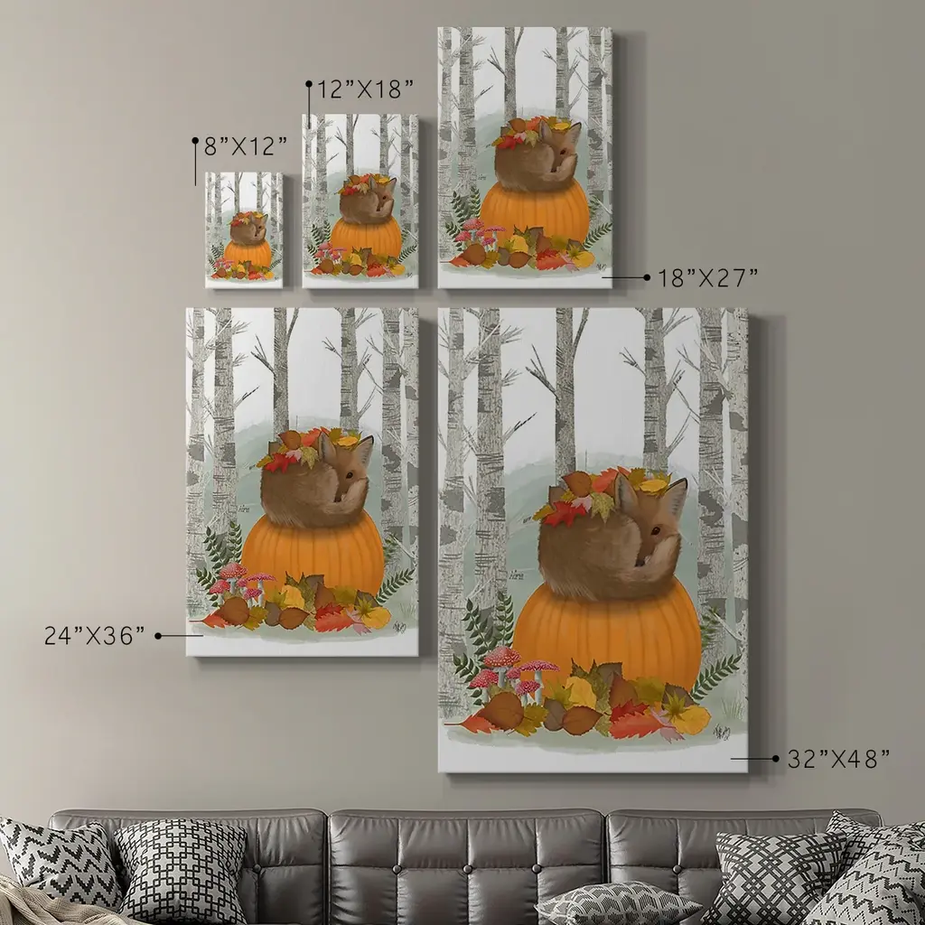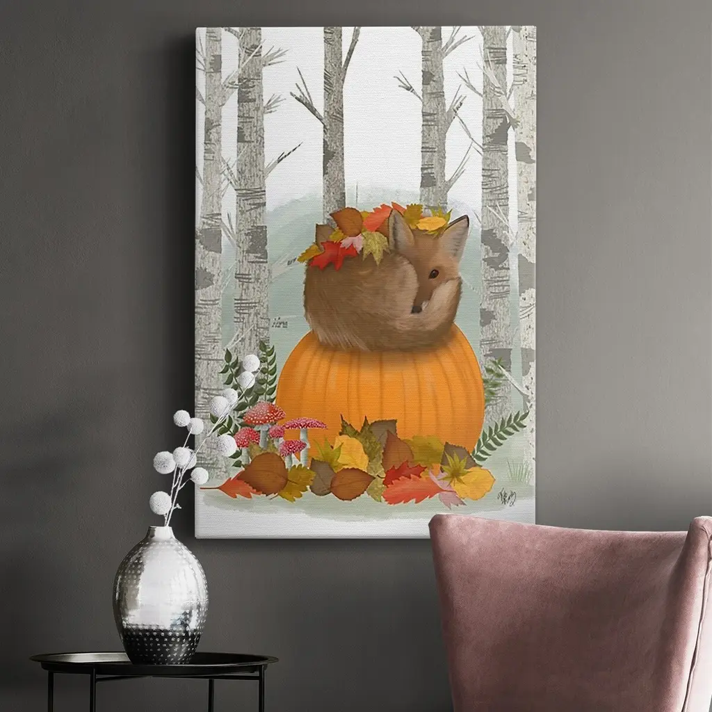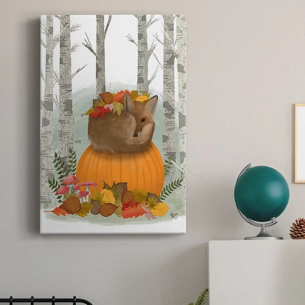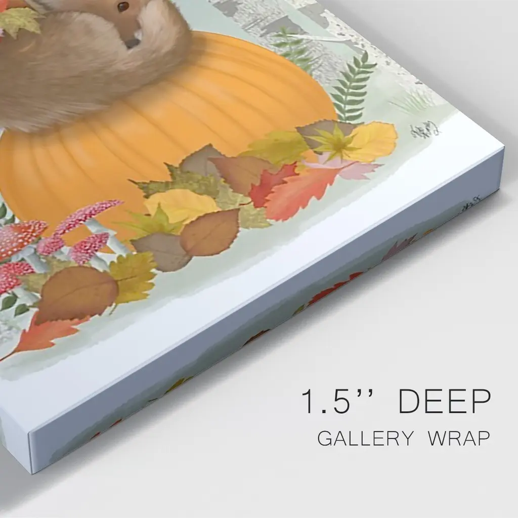 Fox Curled on Pumpkin Premium Gallery Wrapped Canvas - Ready to Hang A premium hand stretched gallery wrapped canvas print created to last. Featuring a beveled a solid wood stretcher bar, each piece comes ready to hand 6 SIZES AVAILABLE 8''X12'' - Overall Size 12''X18'' - Overall Size 18''X27'' - Overall Size 24''x36'' - Overall Size 32''x48'' - Overall Size 40''x60'' - Overall Size Each piece is made to order. Built to Last Each piece comes ready to hang Solid wood stretcher Fade and Water resistant Made domestically