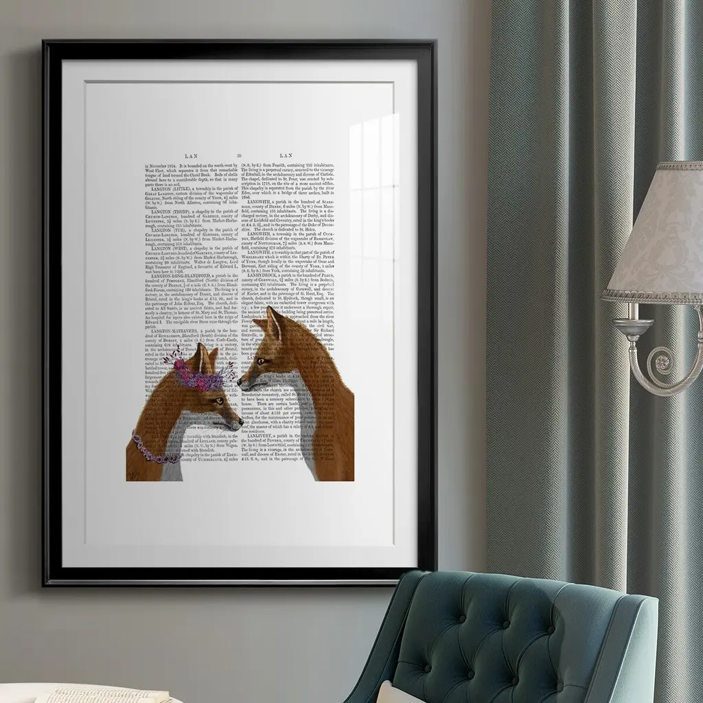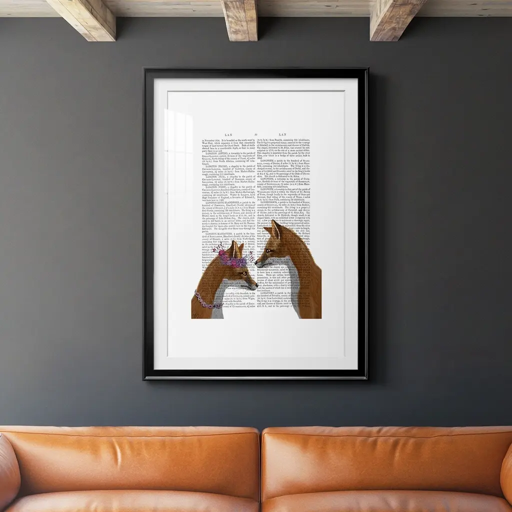 Fox Lovers Premium Framed Print - Ready to Hang A Premium Framed Print created to last. Framed in distressed wood and available in an array of sizes and colors Featuring a beveled a solid wood stretcher bar, each piece comes ready to hand 4 SIZES AVAILABLE 30.5''X42.5'' - Overall Size 26.5'X36.5'' - Overall Size 22.5''x30.5'' - Overall Size 18.5''x24.5'' - Overall Size Each piece is made to order. Each piece comes with hanging hardware. Made in the USA Ready to Hang Giclee Paper Print Acrylic Glass Beveled Matt Board