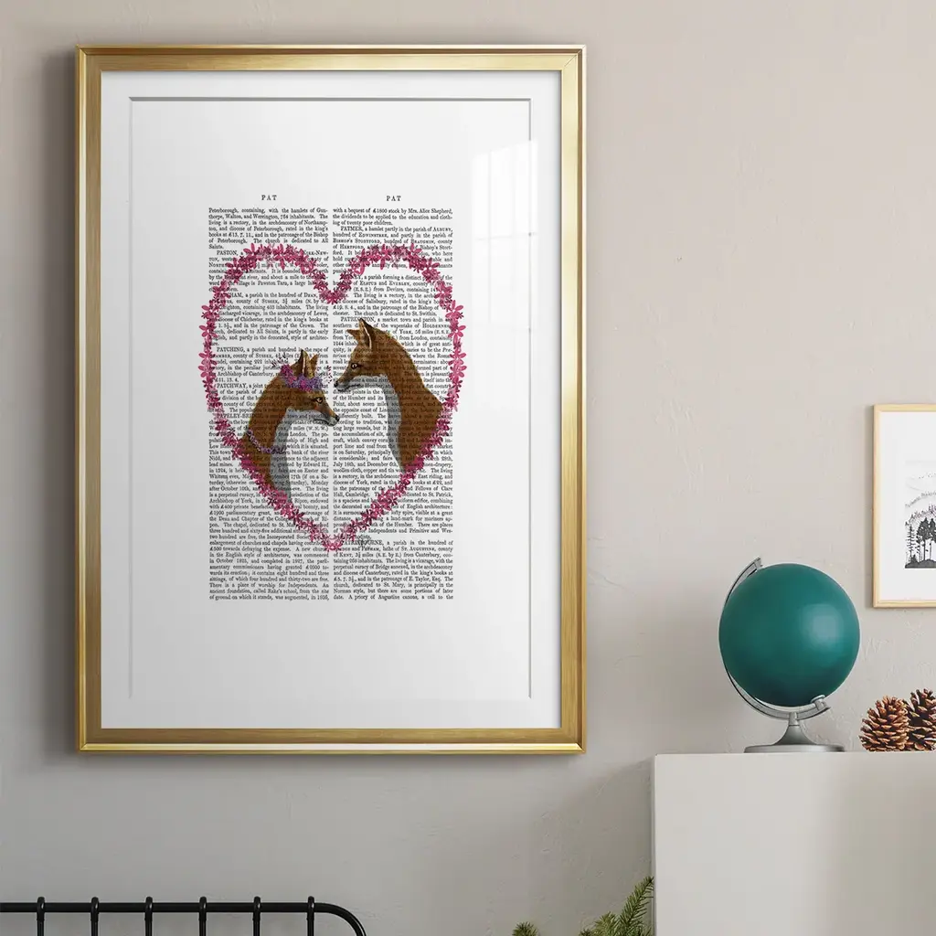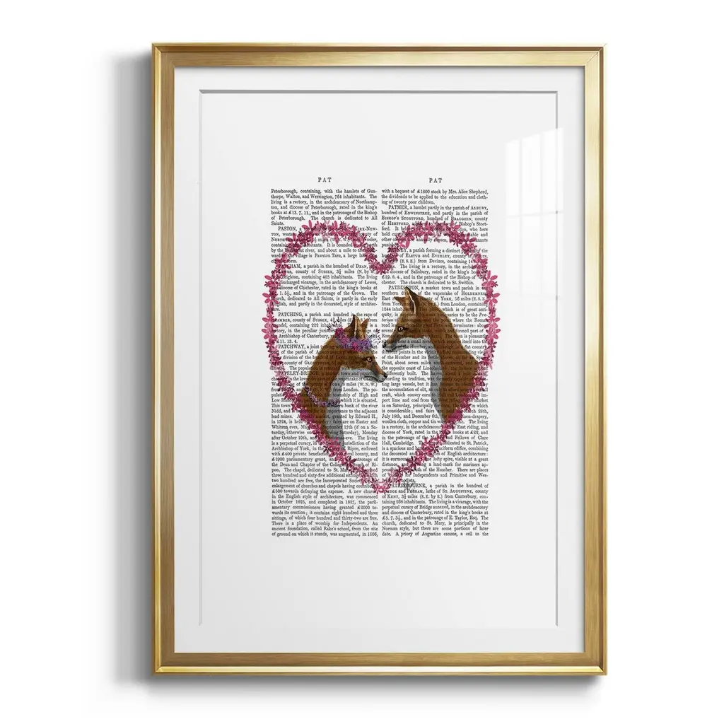 Foxes in Pink Heart Premium Framed Print - Ready to Hang A Premium Framed Print created to last. Framed in distressed wood and available in an array of sizes and colors Featuring a beveled a solid wood stretcher bar, each piece comes ready to hand 4 SIZES AVAILABLE 30.5''X42.5'' - Overall Size 26.5'X36.5'' - Overall Size 22.5''x30.5'' - Overall Size 18.5''x24.5'' - Overall Size Each piece is made to order. Each piece comes with hanging hardware. Made in the USA Ready to Hang Giclee Paper Print Acrylic Glass Beveled Matt Board