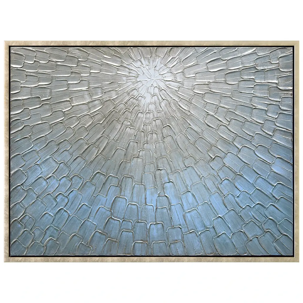 Bring Contemporary Abstraction to your home with this large Circle Metal wall art. This Fractal 3D Blue Splash Burst Metal Artwork makes it the focal point of any room or office. - White Gloss Coating ensures colors are extra vibrant with light reflection.- Aluminum grade Sheet Metal with 1 inch mounting frame on the back giving the illusion that the artwork is floating on the wall..- Mounting Brackets are included along with instructions.- High Quality Digital images are created directly into a glossy aluminum panel producing a stunning and captivating print into the glossy finish of the metal.- Water, Fire and Scratch resistant HD Aluminum panels.- Looks better than any photo paper and guaranteed to last at least 20 years- Easy to clean with a microfiber cloth. Colors are far superior to regular Canvas Art. - Easy to Hang