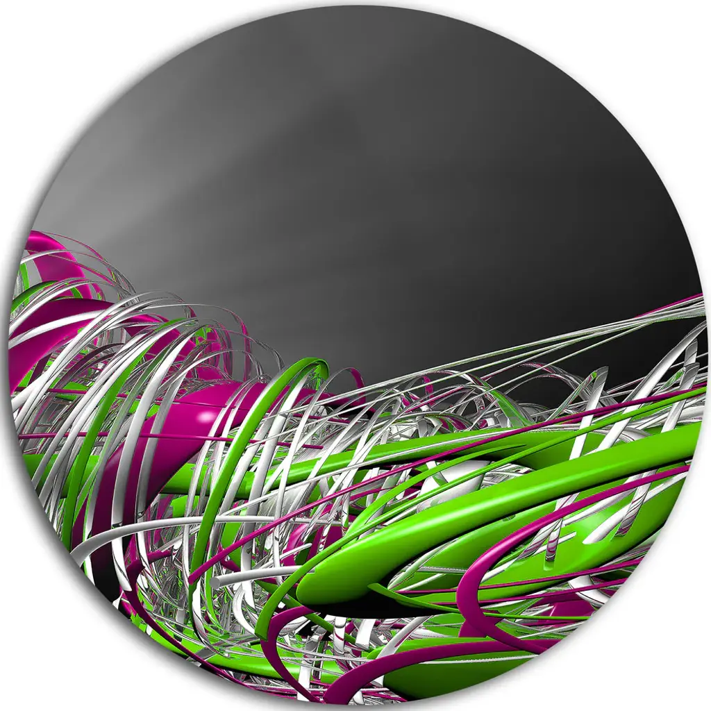 Bring Contemporary Abstraction to your home with this large Circle Metal wall art. This Fractal 3D Green Silver Stripes Metal Artwork makes it the focal point of any room or office. - White Gloss Coating ensures colors are extra vibrant with light reflection.- Aluminum grade Sheet Metal with 1 inch mounting frame on the back giving the illusion that the artwork is floating on the wall..- Mounting Brackets are included along with instructions.- High Quality Digital images are created directly into a glossy aluminum panel producing a stunning and captivating print into the glossy finish of the metal.- Water, Fire and Scratch resistant HD Aluminum panels.- Looks better than any photo paper and guaranteed to last at least 20 years- Easy to clean with a microfiber cloth. Colors are far superior to regular Canvas Art. - Easy to Hang