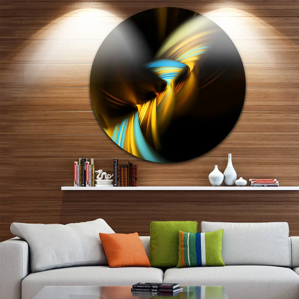 Bring Contemporary Abstraction to your home with this large Circle Metal wall art. This Fractal 3D Layers Yellow Blue Metal Artwork makes it the focal point of any room or office. - White Gloss Coating ensures colors are extra vibrant with light reflection.- Aluminum grade Sheet Metal with 1 inch mounting frame on the back giving the illusion that the artwork is floating on the wall..- Mounting Brackets are included along with instructions.- High Quality Digital images are created directly into a glossy aluminum panel producing a stunning and captivating print into the glossy finish of the metal.- Water, Fire and Scratch resistant HD Aluminum panels.- Looks better than any photo paper and guaranteed to last at least 20 years- Easy to clean with a microfiber cloth. Colors are far superior to regular Canvas Art. - Easy to Hang