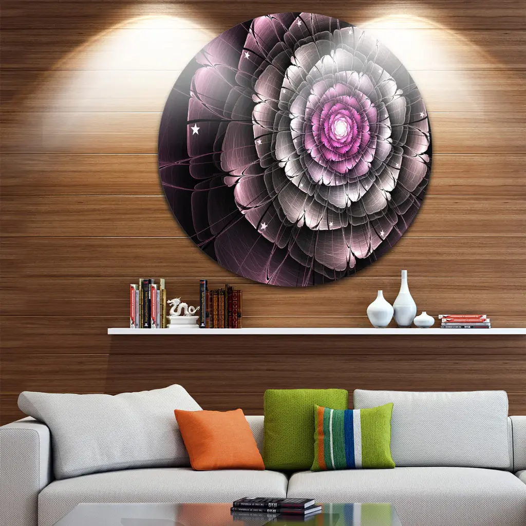 Bring Contemporary Abstraction to your home with this large Circle Metal wall art. This Fractal Flower Glossy Pink Digital Art Metal Artwork makes it the focal point of any room or office. - White Gloss Coating ensures colors are extra vibrant with light reflection.- Aluminum grade Sheet Metal with 1 inch mounting frame on the back giving the illusion that the artwork is floating on the wall..- Mounting Brackets are included along with instructions.- High Quality Digital images are created directly into a glossy aluminum panel producing a stunning and captivating print into the glossy finish of the metal.- Water, Fire and Scratch resistant HD Aluminum panels.- Looks better than any photo paper and guaranteed to last at least 20 years- Easy to clean with a microfiber cloth. Colors are far superior to regular Canvas Art. - Easy to Hang