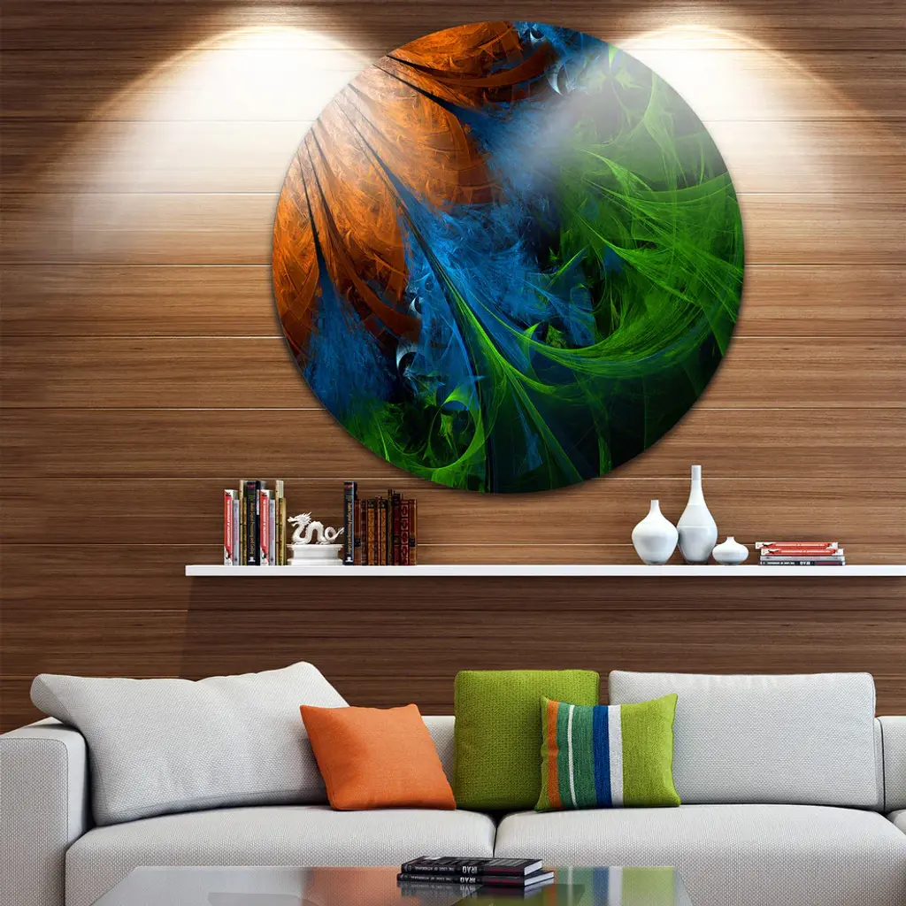 Bring Contemporary Abstraction to your home with this large Circle Metal wall art. This Fractal Flower Orange and Blue Metal Artwork makes it the focal point of any room or office. - White Gloss Coating ensures colors are extra vibrant with light reflection.- Aluminum grade Sheet Metal with 1 inch mounting frame on the back giving the illusion that the artwork is floating on the wall..- Mounting Brackets are included along with instructions.- High Quality Digital images are created directly into a glossy aluminum panel producing a stunning and captivating print into the glossy finish of the metal.- Water, Fire and Scratch resistant HD Aluminum panels.- Looks better than any photo paper and guaranteed to last at least 20 years- Easy to clean with a microfiber cloth. Colors are far superior to regular Canvas Art. - Easy to Hang