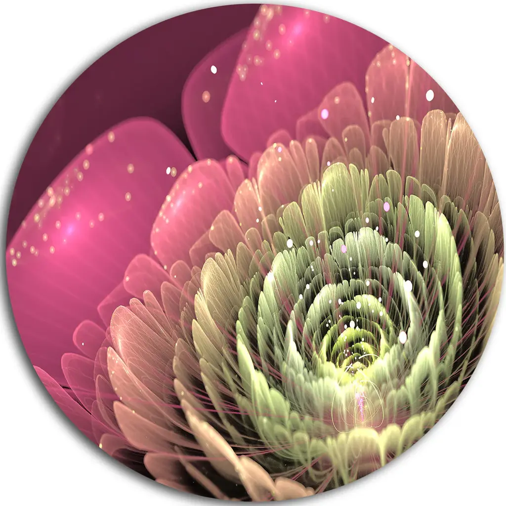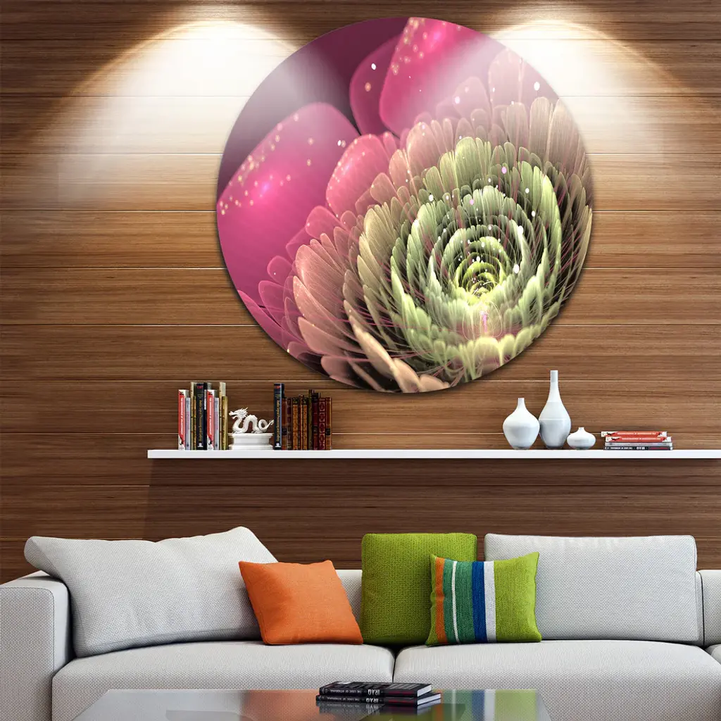 Bring Contemporary Abstraction to your home with this large Circle Metal wall art. This Fractal Flower Pink and Green Metal Artwork makes it the focal point of any room or office. - White Gloss Coating ensures colors are extra vibrant with light reflection.- Aluminum grade Sheet Metal with 1 inch mounting frame on the back giving the illusion that the artwork is floating on the wall..- Mounting Brackets are included along with instructions.- High Quality Digital images are created directly into a glossy aluminum panel producing a stunning and captivating print into the glossy finish of the metal.- Water, Fire and Scratch resistant HD Aluminum panels.- Looks better than any photo paper and guaranteed to last at least 20 years- Easy to clean with a microfiber cloth. Colors are far superior to regular Canvas Art. - Easy to Hang