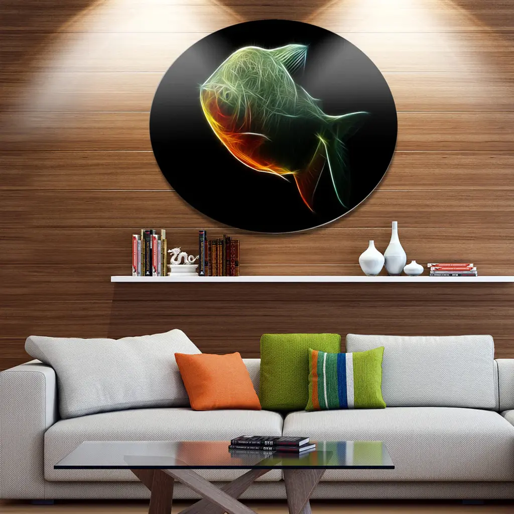 Bring Contemporary Abstraction to your home with this large Circle Metal wall art. This Fractal Pacu Fish on Black Metal Artwork makes it the focal point of any room or office. - White Gloss Coating ensures colors are extra vibrant with light reflection.- Aluminum grade Sheet Metal with 1 inch mounting frame on the back giving the illusion that the artwork is floating on the wall..- Mounting Brackets are included along with instructions.- High Quality Digital images are created directly into a glossy aluminum panel producing a stunning and captivating print into the glossy finish of the metal.- Water, Fire and Scratch resistant HD Aluminum panels.- Looks better than any photo paper and guaranteed to last at least 20 years- Easy to clean with a microfiber cloth. Colors are far superior to regular Canvas Art. - Easy to Hang