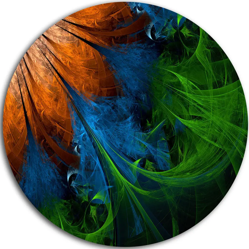 Bring Contemporary Abstraction to your home with this large Circle Metal wall art. This Fractal Digital Paint Pattern Metal Artwork makes it the focal point of any room or office. - White Gloss Coating ensures colors are extra vibrant with light reflection.- Aluminum grade Sheet Metal with 1 inch mounting frame on the back giving the illusion that the artwork is floating on the wall..- Mounting Brackets are included along with instructions.- High Quality Digital images are created directly into a glossy aluminum panel producing a stunning and captivating print into the glossy finish of the metal.- Water, Fire and Scratch resistant HD Aluminum panels.- Looks better than any photo paper and guaranteed to last at least 20 years- Easy to clean with a microfiber cloth. Colors are far superior to regular Canvas Art. - Easy to Hang