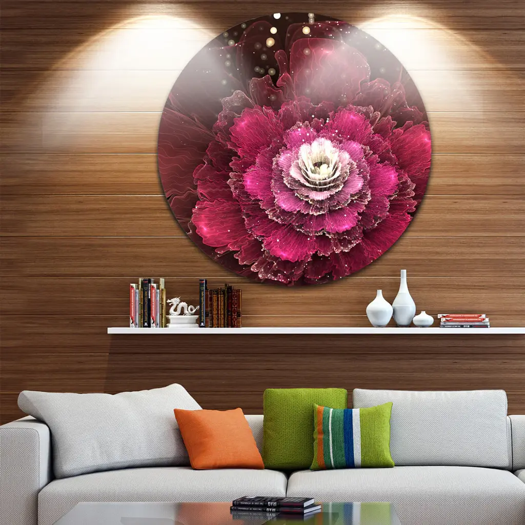 Bring Contemporary Abstraction to your home with this large Circle Metal wall art. This Fractal Red Rose Flower Metal Artwork makes it the focal point of any room or office. - White Gloss Coating ensures colors are extra vibrant with light reflection.- Aluminum grade Sheet Metal with 1 inch mounting frame on the back giving the illusion that the artwork is floating on the wall..- Mounting Brackets are included along with instructions.- High Quality Digital images are created directly into a glossy aluminum panel producing a stunning and captivating print into the glossy finish of the metal.- Water, Fire and Scratch resistant HD Aluminum panels.- Looks better than any photo paper and guaranteed to last at least 20 years- Easy to clean with a microfiber cloth. Colors are far superior to regular Canvas Art. - Easy to Hang