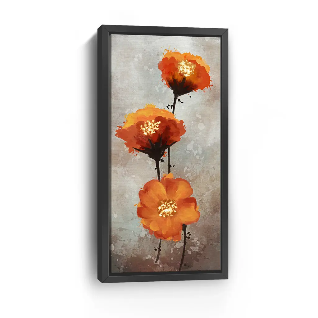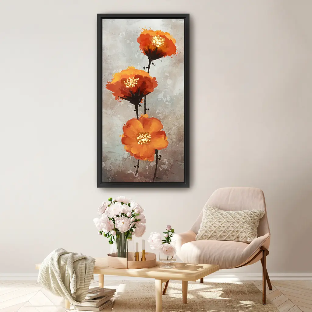 Vibrant orange blossoms bloom with painterly depth against a soft, weathered backdrop, creating a striking balance of warmth and elegance. This floral artwork radiates energy, grace, and a touch of modern sophistication. Our Gallery Wrap Canvas Prints are proudly assembled with high quality materials in California, USA. Each piece is printed on a thick, archival grade canvas using Giclee technology. It is then hand-stretched by our experienced artisans over solid wood bars, which will not warp over time. The final product is a piece personally crafted for you to confidently display on your wall. Care and Assembly: Ensure that the location of your piece has little to no exposure to heat, sunlight, and moisture. Wipe clean, only if needed. Each piece includes hanging hardware to hang on your wall vertically.