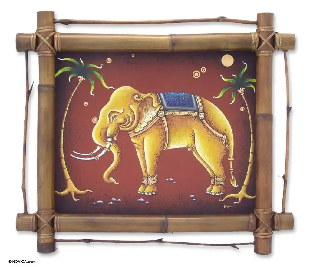 Arrayed in a blue saddle blanket with golden chains, an elephant is portrayed in golden light. Parinya Nanjai paints an elegant portrait of the royal symbol. The first record of a white elephant captured in Thailand was in 1471, and King Borommatrailokkanant took the title "Lord of the White Elephant." In the 1500s, King Mahachakkaphat had seven white elephants in his herd. By the 17th century, elephant hunting was the sport of kings. White elephants graced the Siamese national flags of 1816 and 1917 before Siam was re-named Thailand. The painting is framed in bamboo.