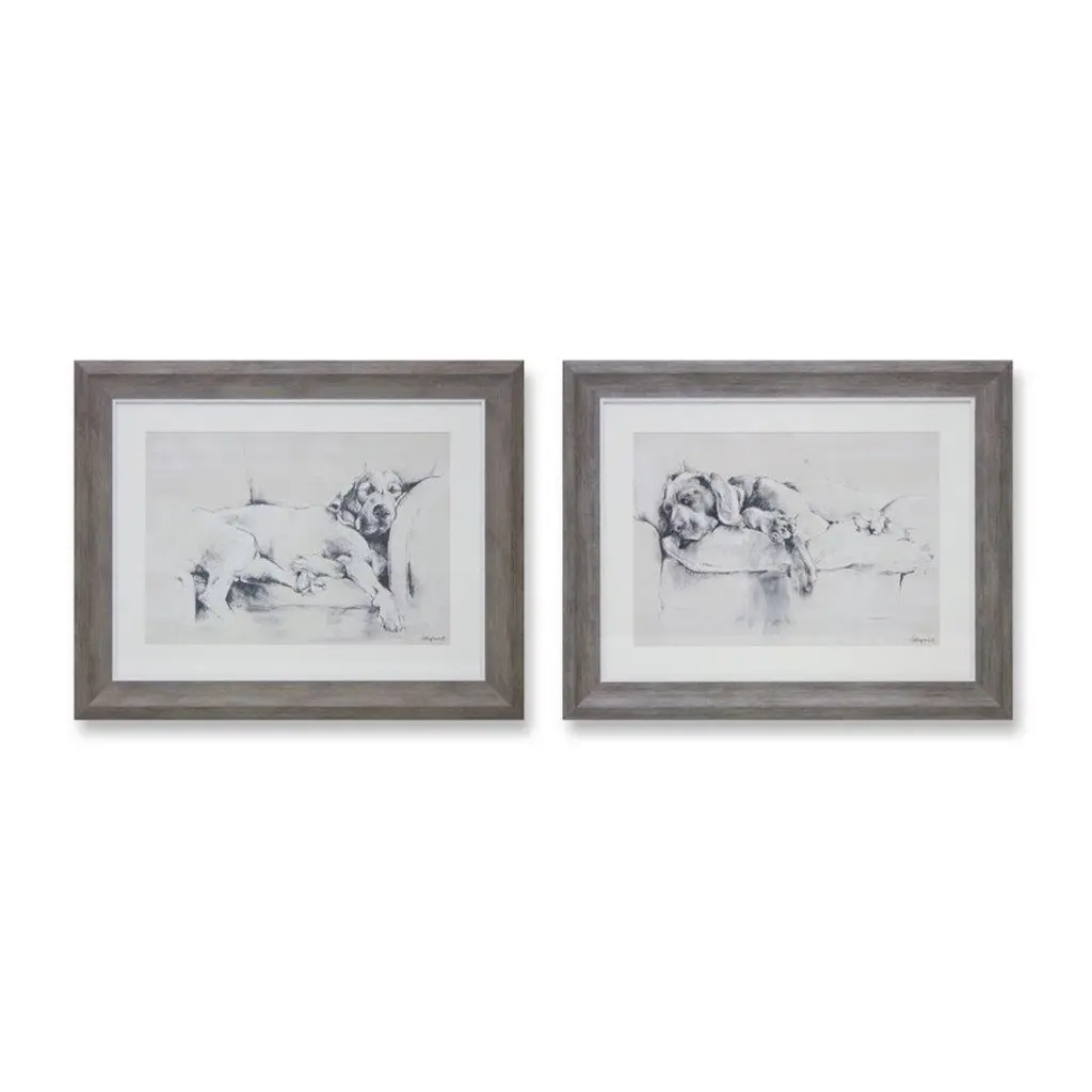 Celebrate your love for dogs with this set of 2 assorted black and white framed dog prints. Each piece measures 22.5" long x 18" high and features a beautifully detailed dog illustration in a classic monochrome palette. Framed in a sleek MDF and plastic frame, these prints offer a timeless and elegant touch to any space. Perfect for dog lovers, they make a charming addition to living rooms, bedrooms, offices, or entryways. Display them together for a coordinated look or separately to enhance different areas of your home.