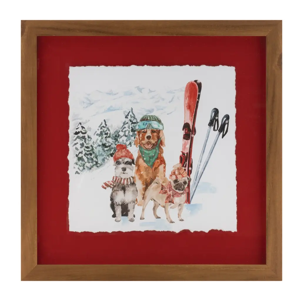 Add a whimsical touch to your holiday decor with this charming set of prints featuring dog characters with sled and ski accents. Set in bold red mats under glass, these playful artworks bring a fun, wintry vibe to your cabin or ski-themed displays. Perfect for your living room or kitchen, this set also makes a delightful gift for dog lovers and skiers alike. Each piece in the set comes with a sawtooth hook on the back for securing them safely to the walls of your home.