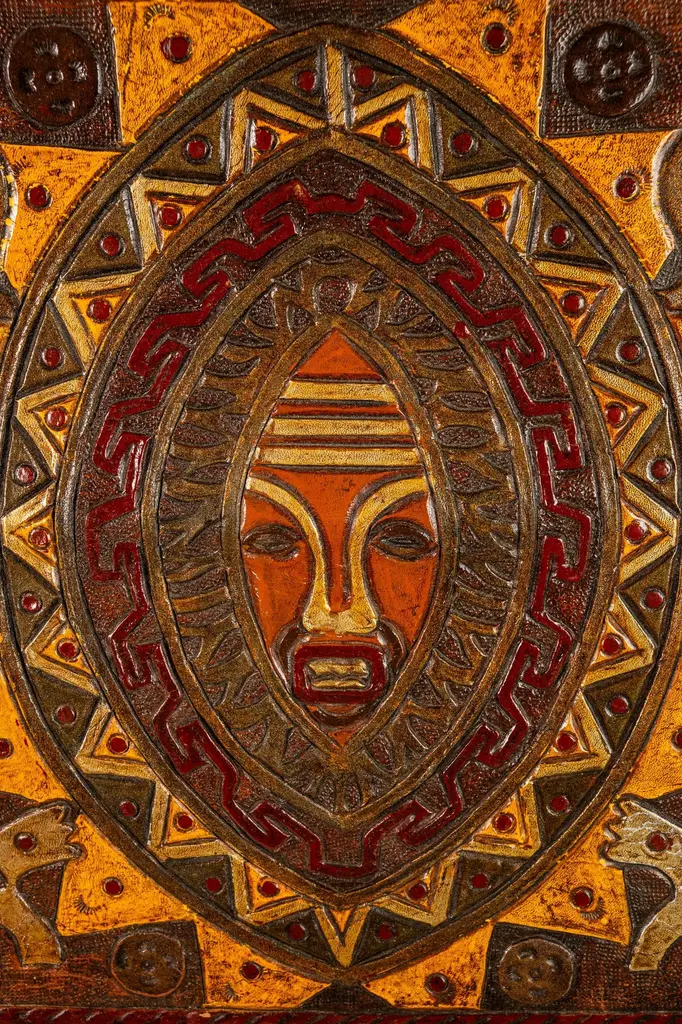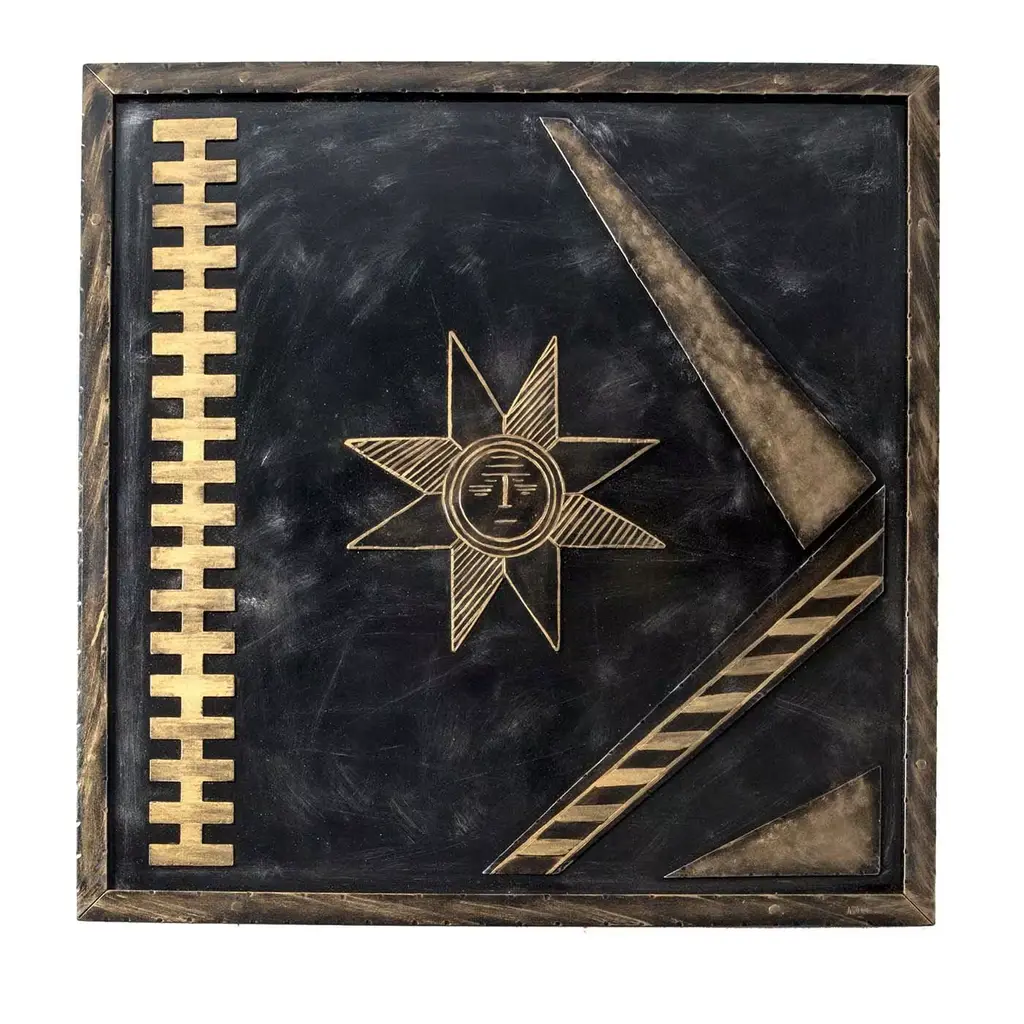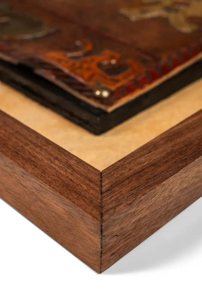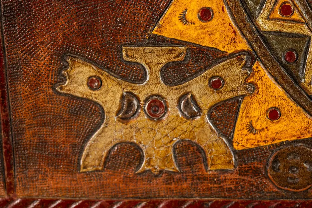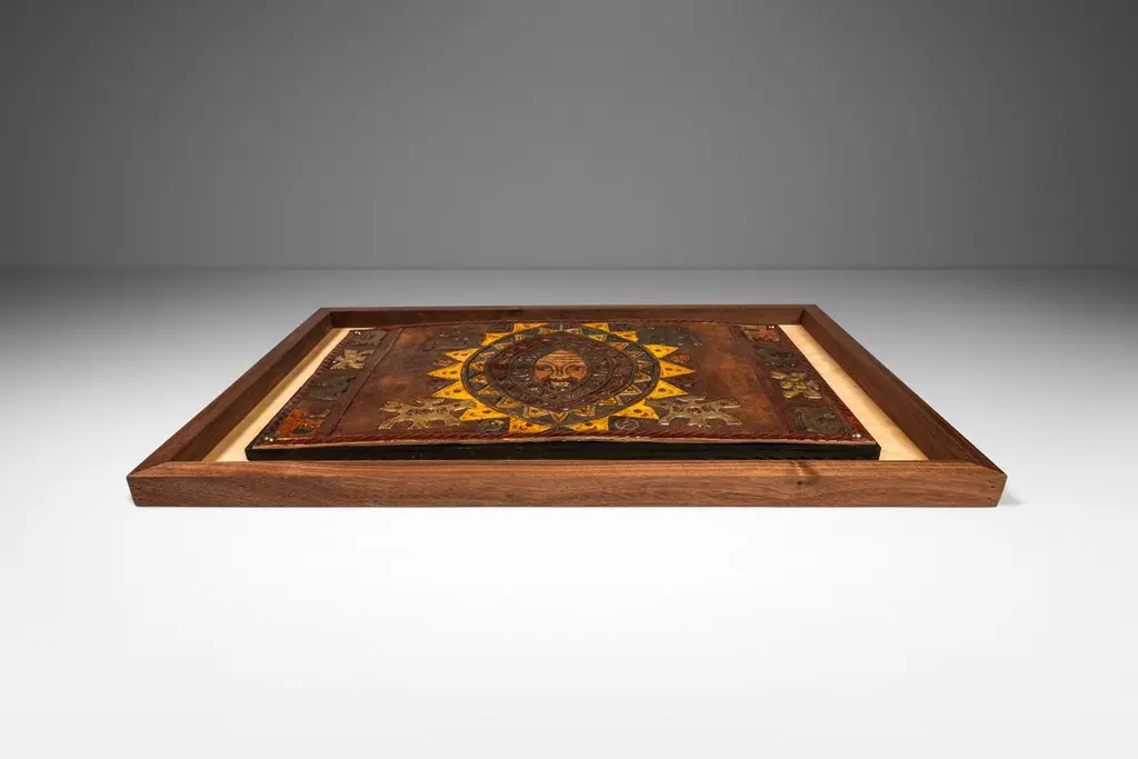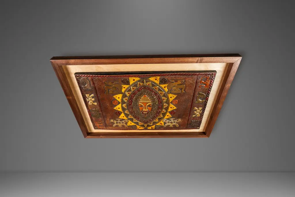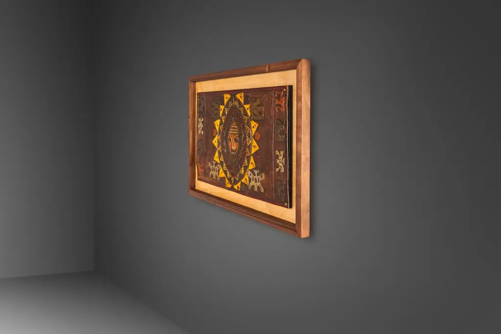 Introducing an extraordinary embossed leather art by the incomparable furniture designer and artisan Angel Pazmino. Cut from a set of sling chairs by Pazmino this truly one of a kind artwork is the epitome of 'custom' and 'hand-made'. The frame has been hand-milled from a solid slab of sustainably sourced American black walnut by our carpenters perfectly offsetting the character-rich patina of the embossed leather within depicting, among other Incan symbols, Supay - the Incan god of death and guide to the afterlife.Angel Pazmino is an Ecuadorian furniture maker who has, in recent years, earned world-wide acclaim for his unlikely merging of pre-Columbian American and Mid-Century Modern design elements into his works. Born in 1926, Pazmino began his woodworking career in 1944 as a cabinet maker. Throughout the 1950's and 60's Pazmino travelled throughout the Americas where he exhibited his work and took inspiration from traditional Ameri-Indian artists and techniques. In the late 1960's he added his second authorial characteristic, incorporating graphic elements from the continent's native cultures reviving, as he put it, “the ancient and aristocratic art of leather embossing,” learning from such artisans as master saddler Ignacito Ortiz.With it's striking depictions of Incan mythology, intricate hand-tooled and embossed saddle-grade leather and a custom, hand-made frame cut from solid black walnut this truly one-of-a-kind art piece is sure to make a BOLD impression in any space it inhabits and is absolutely arresting from any angle. Ideal for designers and collectors alike searching for authentic folk-art from the Andes region this visually arresting piece can blend seamlessly against a myriad of design backdrops from Spanish Hacienda to Safari to Boho Chic and is the perfect addition to any collection.Just as Pazmino merged the design aesthetics of Scandinavian Modern and Spanish Hacienda so too we find this artwork merging the techniques, beliefs and aesthetics of both the Spanish and Native American design creating a uniquely original, honest outcome blending both the New and Old Worlds as no one else has ever done. Make it yours today before it's gone forever.---Dimensions---Width: 25 in / 63.5 cmDepth: 1 in / 2.54 cmHeight: 17 in / 43.18 cmThis artfully-crafted leather artwork and frame has recently undergone a comprehensive and transformative restoration process. The hand-milled custom frames, cut from solid slabs of American black walnut shows no wear and the variegated woodgrains are absolutely stunning in natural light.The patinaed, hand-embossed leather artwork within shows only the wear of a once loved and utilized chair component but shows no stains, rips or other damage whatsoever.This gorgeous and striking artwork piece is structurally sound and ready for centuries of use. Please view all photos and videos for details on this piece's current condition. We're limited on the amount of media we can post so additional photos and videos are available upon request.