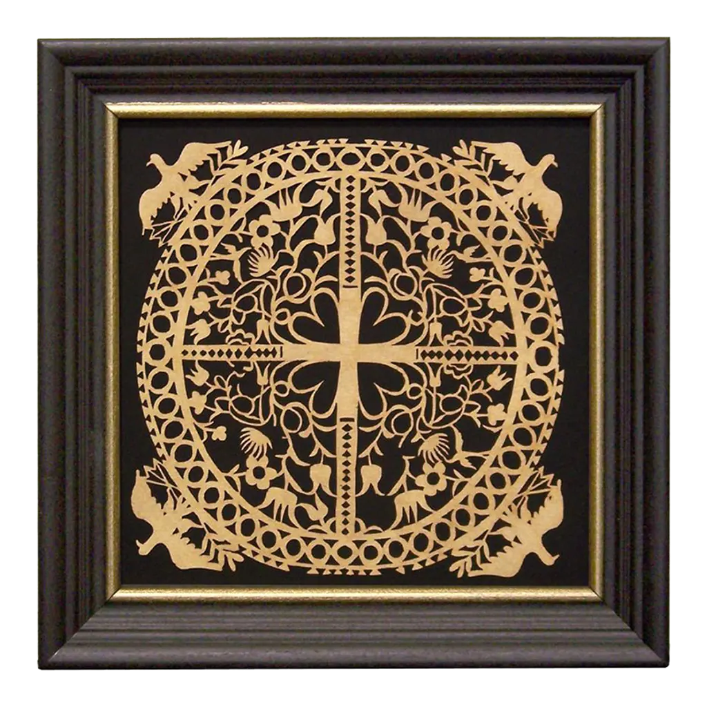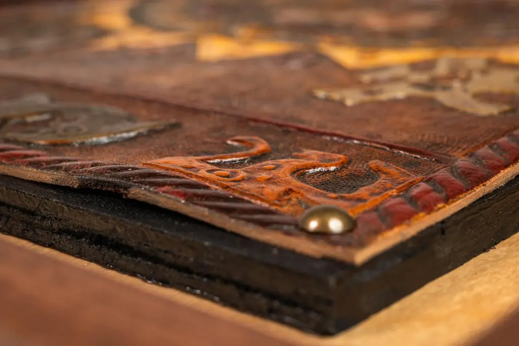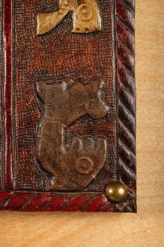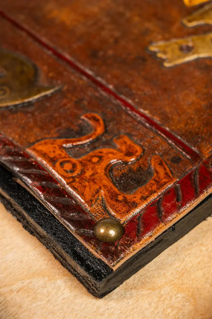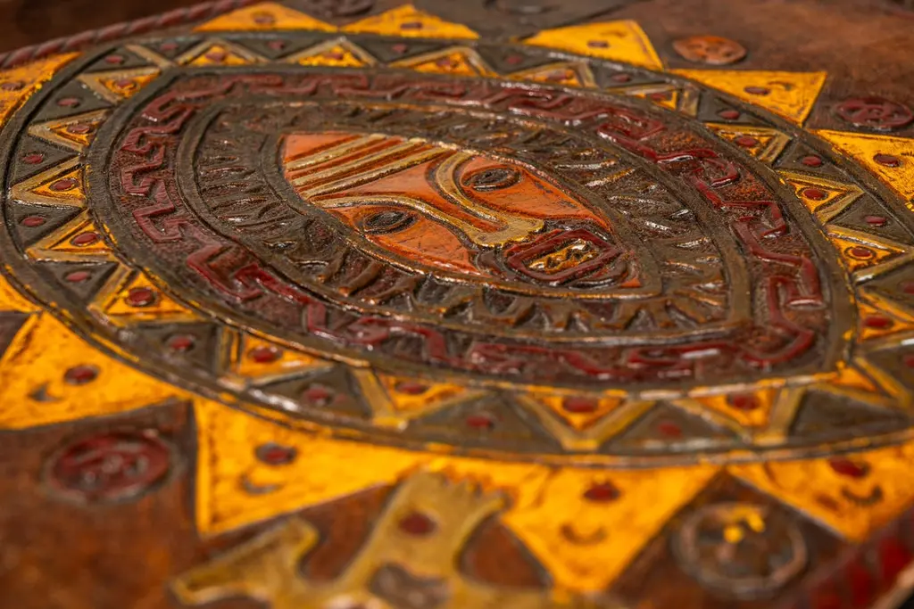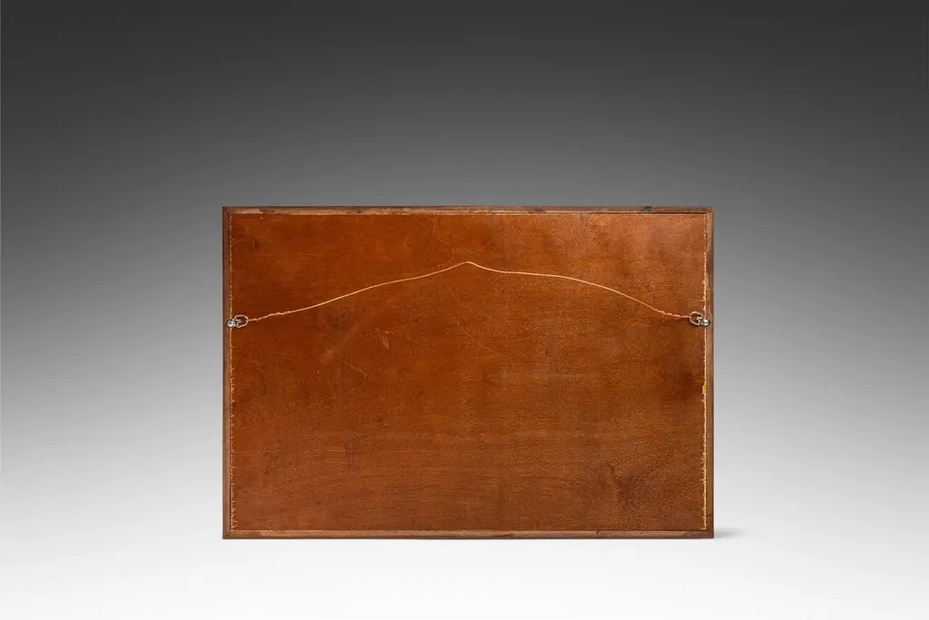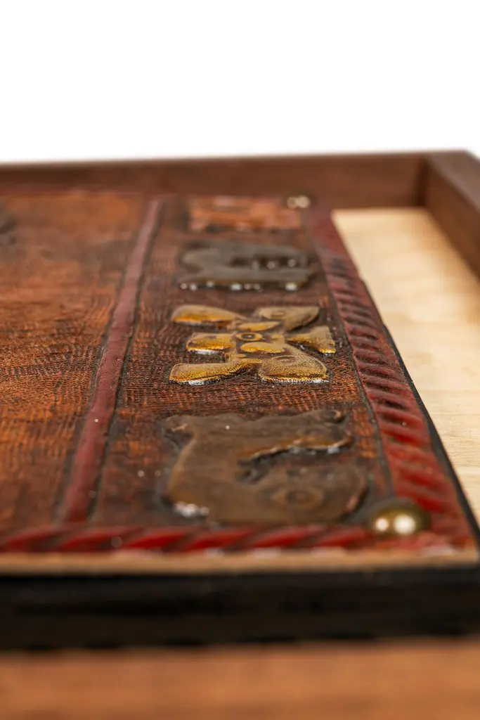 Introducing an extraordinary embossed leather art by the incomparable furniture designer and artisan Angel Pazmino. Cut from a set of sling chairs by Pazmino this truly one of a kind artwork is the epitome of 'custom' and 'hand-made'. The frame has been hand-milled from a solid slab of sustainably sourced American black walnut by our carpenters perfectly offsetting the character-rich patina of the embossed leather within depicting, among other Incan symbols, Supay - the Incan god of death and guide to the afterlife.Angel Pazmino is an Ecuadorian furniture maker who has, in recent years, earned world-wide acclaim for his unlikely merging of pre-Columbian American and Mid-Century Modern design elements into his works. Born in 1926, Pazmino began his woodworking career in 1944 as a cabinet maker. Throughout the 1950's and 60's Pazmino travelled throughout the Americas where he exhibited his work and took inspiration from traditional Ameri-Indian artists and techniques. In the late 1960's he added his second authorial characteristic, incorporating graphic elements from the continent's native cultures reviving, as he put it, “the ancient and aristocratic art of leather embossing,” learning from such artisans as master saddler Ignacito Ortiz.With it's striking depictions of Incan mythology, intricate hand-tooled and embossed saddle-grade leather and a custom, hand-made frame cut from solid black walnut this truly one-of-a-kind art piece is sure to make a BOLD impression in any space it inhabits and is absolutely arresting from any angle. Ideal for designers and collectors alike searching for authentic folk-art from the Andes region this visually arresting piece can blend seamlessly against a myriad of design backdrops from Spanish Hacienda to Safari to Boho Chic and is the perfect addition to any collection.Just as Pazmino merged the design aesthetics of Scandinavian Modern and Spanish Hacienda so too we find this artwork merging the techniques, beliefs and aesthetics of both the Spanish and Native American design creating a uniquely original, honest outcome blending both the New and Old Worlds as no one else has ever done. Make it yours today before it's gone forever.---Dimensions---Width: 25 in / 63.5 cmDepth: 1 in / 2.54 cmHeight: 17 in / 43.18 cmThis artfully-crafted leather artwork and frame has recently undergone a comprehensive and transformative restoration process. The hand-milled custom frames, cut from solid slabs of American black walnut shows no wear and the variegated woodgrains are absolutely stunning in natural light.The patinaed, hand-embossed leather artwork within shows only the wear of a once loved and utilized chair component but shows no stains, rips or other damage whatsoever.This gorgeous and striking artwork piece is structurally sound and ready for centuries of use. Please view all photos and videos for details on this piece's current condition. We're limited on the amount of media we can post so additional photos and videos are available upon request.