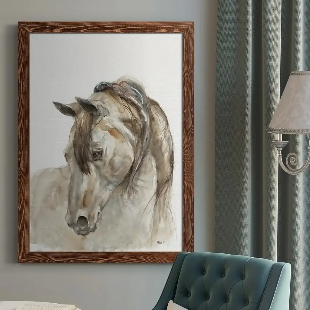 This Framed Horse Canvas Art captures the majestic beauty of a horse in a modern, artistic style. Featuring cool beige and gray tones, the painted horse head is beautifully printed on canvas with textured accents for a refined touch. Framed with natural wood grain for an added rustic appeal, this piece effortlessly complements your modern farmhouse or country-style décor. The piece comes with a sawtooth hook on the back for securing it safely to the wall of your home. Display it in your living room, hallway, or bedroom to bring nature-inspired elegance to your home.