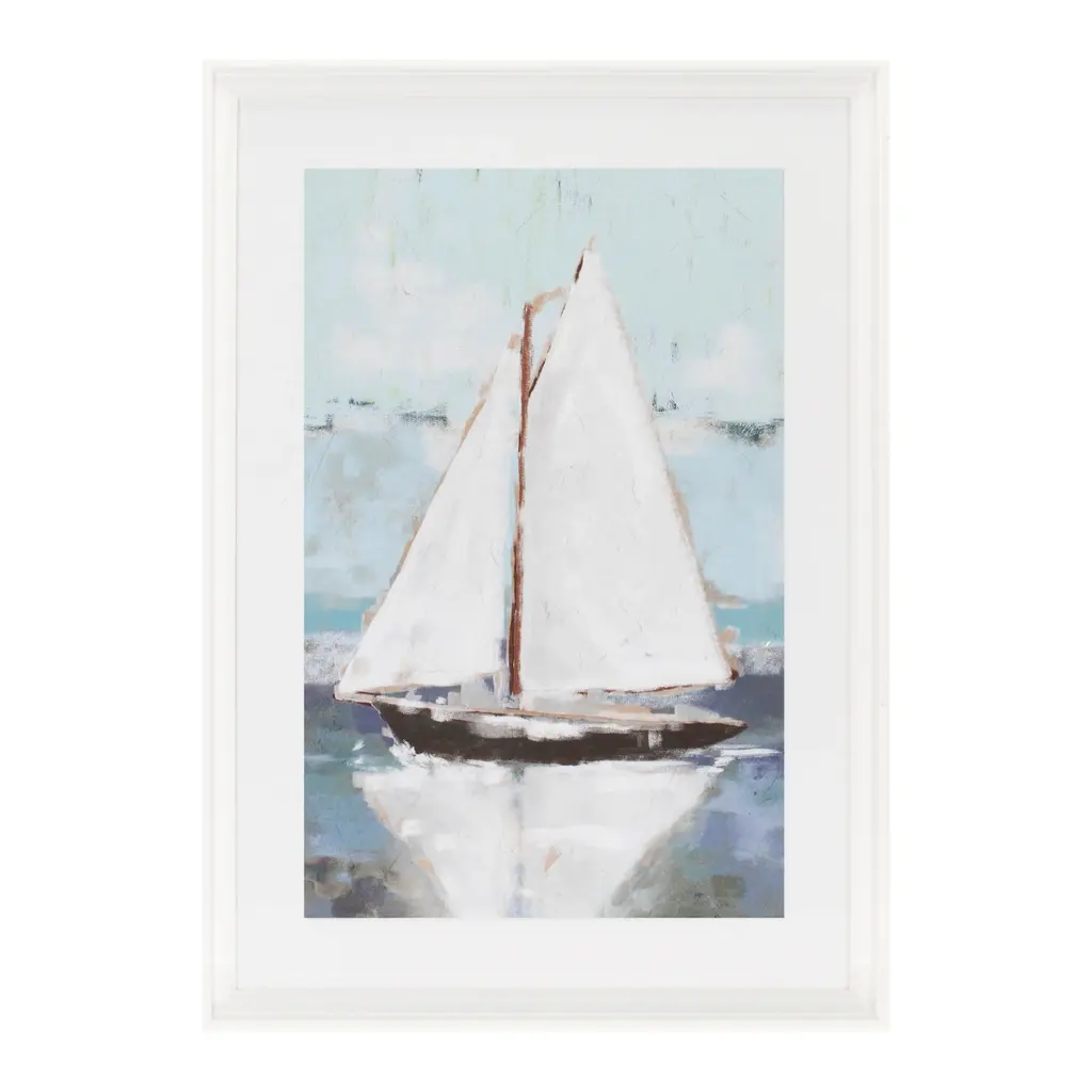 Bring the serenity of the sea to your space with this Framed Sail Boat Print. Featuring cool blue and white tones, these modern sailboat prints are framed with a crisp white wooden border, adding a coastal touch to your décor. Sold in a set of two assorted designs, each print is complemented by a delicate white matte outline that enhances the clean, nautical aesthetic. Each piece comes with two D-ring hangers on the back for securing them safely to the walls of your home. Perfect for your coastal, nautical, or lakehouse décor, these prints will fill your walls with a calming, maritime charm.