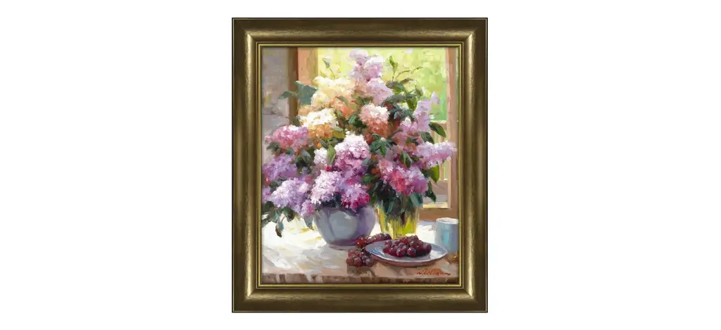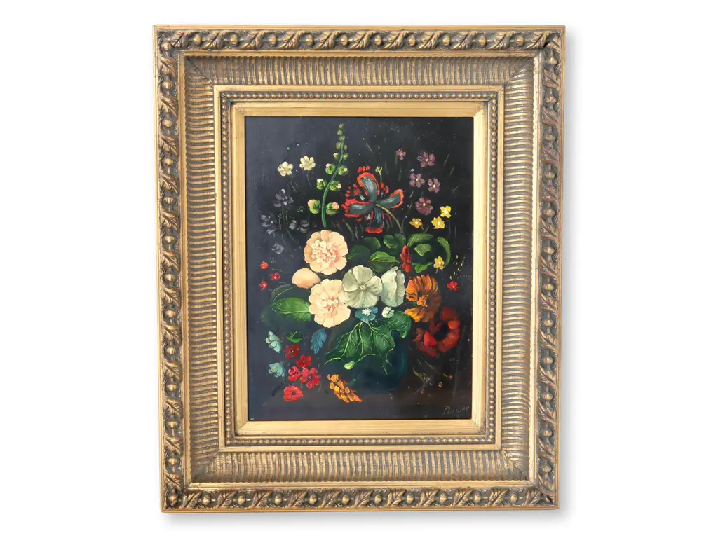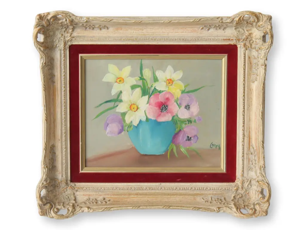 This still life from the late 20th century, features a vibrant floral arrangement, beautifully set in a heavily carved, gold frame. This exquisite piece exudes elegance and sophistication, making it a perfect addition for art lovers and collectors. Whether displayed in a living room, bedroom, or hallway, it brings a timeless charm and artistic flair to any decor. Ideal for adding a touch of refined beauty to your home, this painting is sure to captivate and inspire. Signed lower right corner.