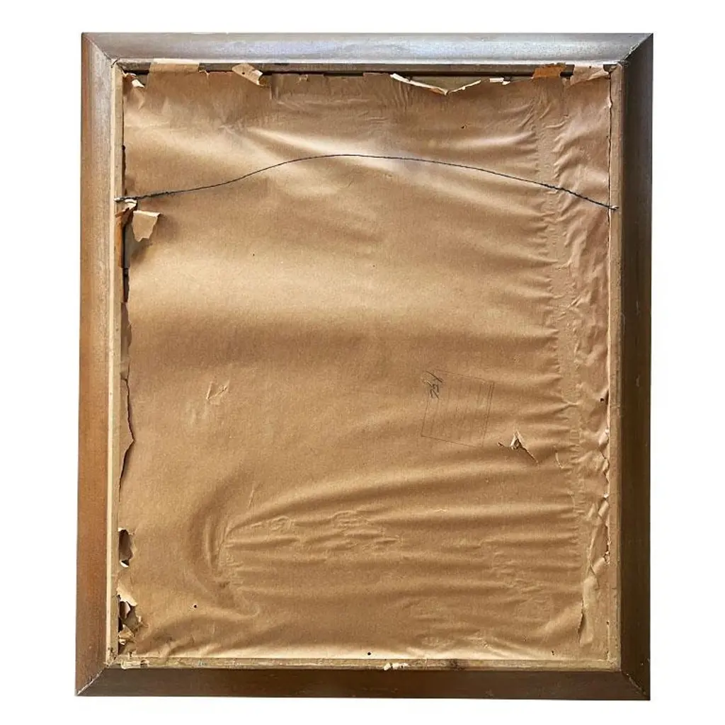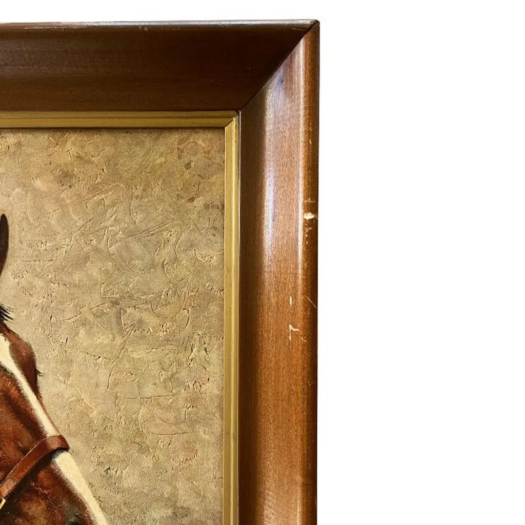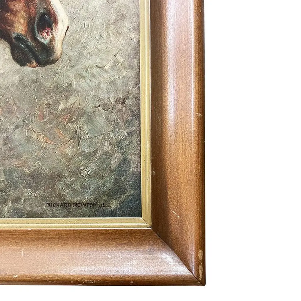 A framed lithograph of a thoroughbred horse by Richard Newton Jr. This piece is housed in a wood frame and depicts a thoroughbred horse with a deep chestnut brown coat and a white blaze down his nose. The horse looks forward with its eyes fixed on the viewer. He has a brown bridle with gold accents. This piece is not under glass and has been professionally framed. The back includes a hanging wire. This piece was sourced from the estate of an Oklahoma horse breeder. His home was filled with the most amazing antique saddles, sculptures, show trophies, and saddle blankets. Richard Newton Jr. (1874-1951) was a famous equestrian artist known for his horse and jockey paintings. Dimensions:25" Wide29" Tall2.25" Deep