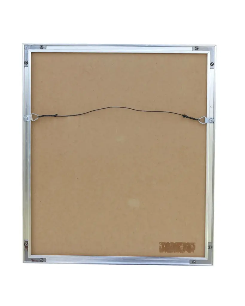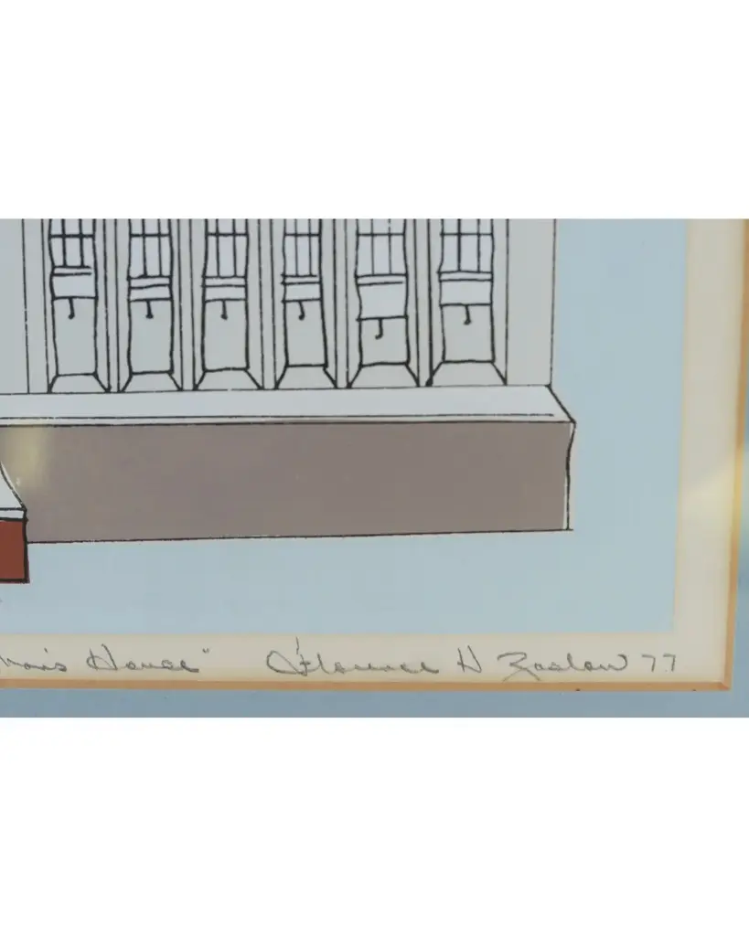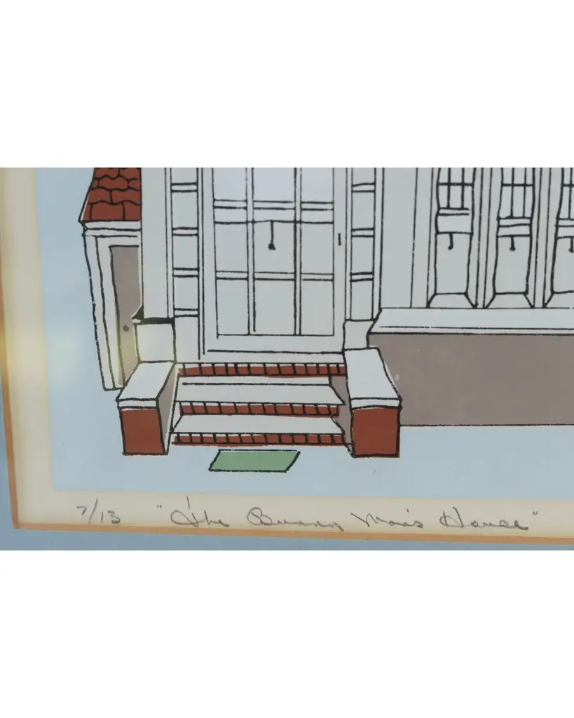 A front elevation sketch of a Queen Anne town house. Reads “The Bunny Man��s House” lower left, signed Florence H. Laslau ‘77 in the lower right. Comes in a silver metal frame, wired and ready to hang.