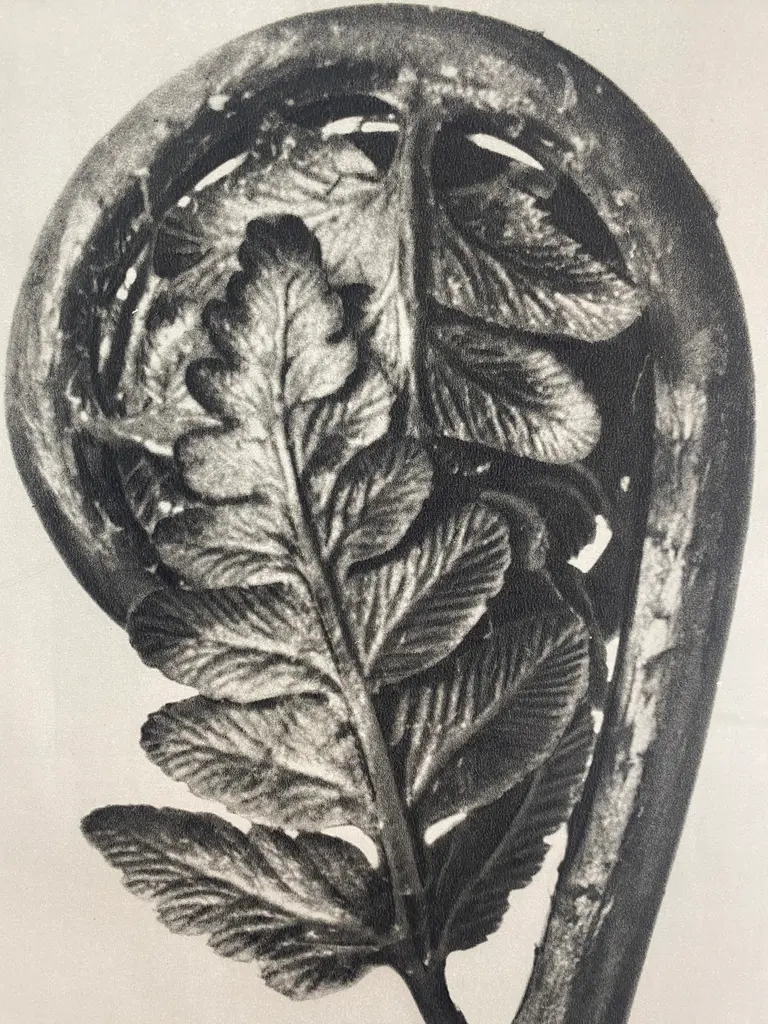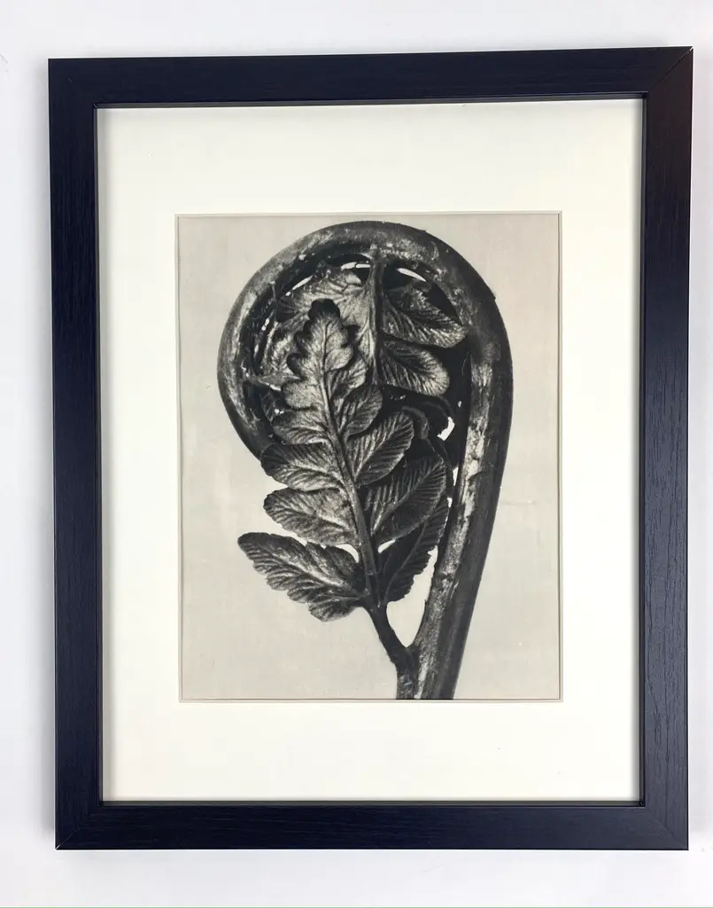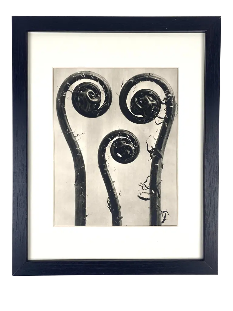 Exquisite Botanical photogravure from famed Urformen Der Kunst portfolio by Blossfeldt . Karl Blossfeldt (1865 - 1932) was a German professor of sculpture, artist and photographer. His images were some of the most innovative photographic work of the time. He is best known for his magnified photographs of plants. Blossfeldt actually made his own camera that could magnify up to thirty times. He revealed extraordinary shapes in plants. This particular botanical image is No. 6 - Polypody Young Unrolling Leaf. Enlarged 4X. The frame is wooden, painted black, with glass