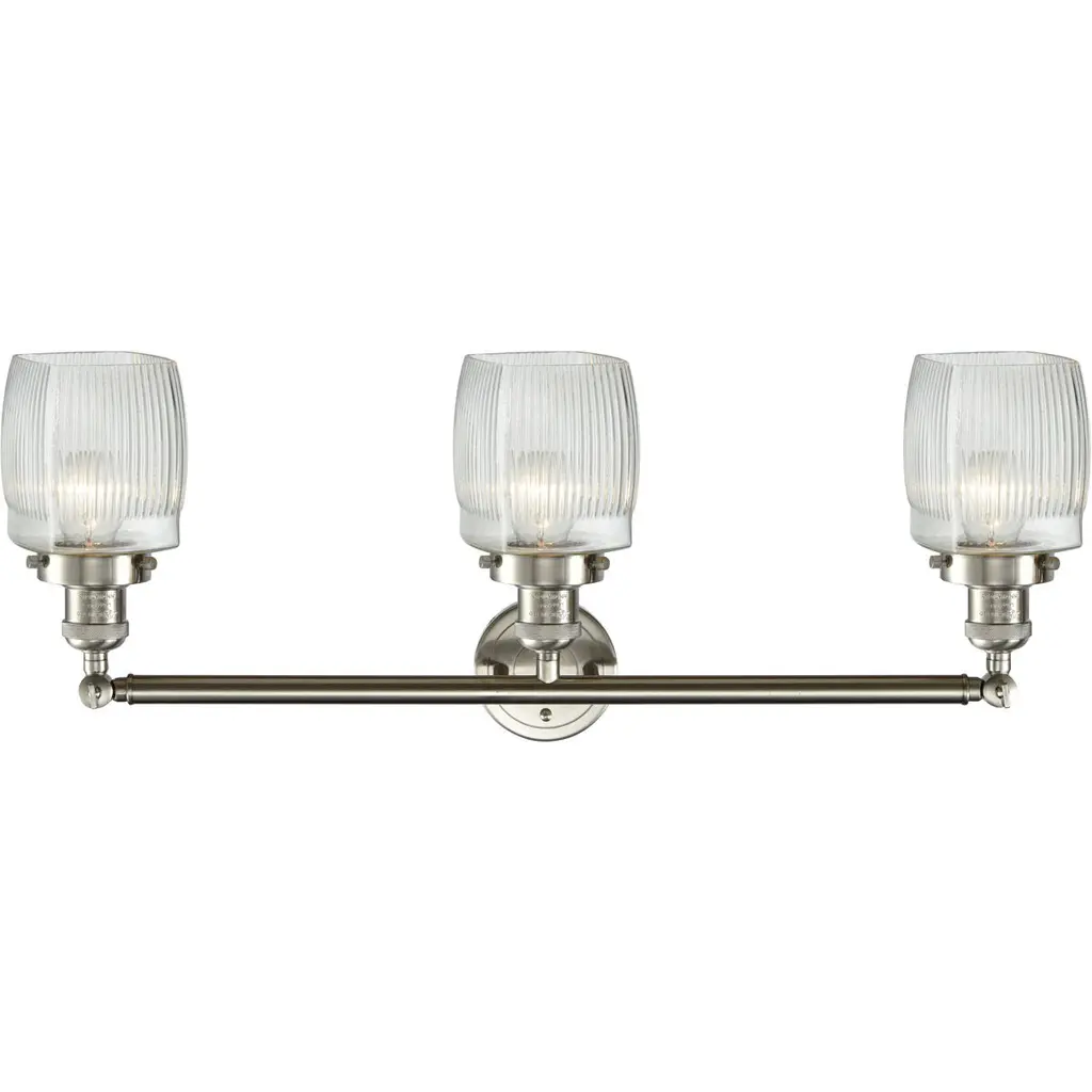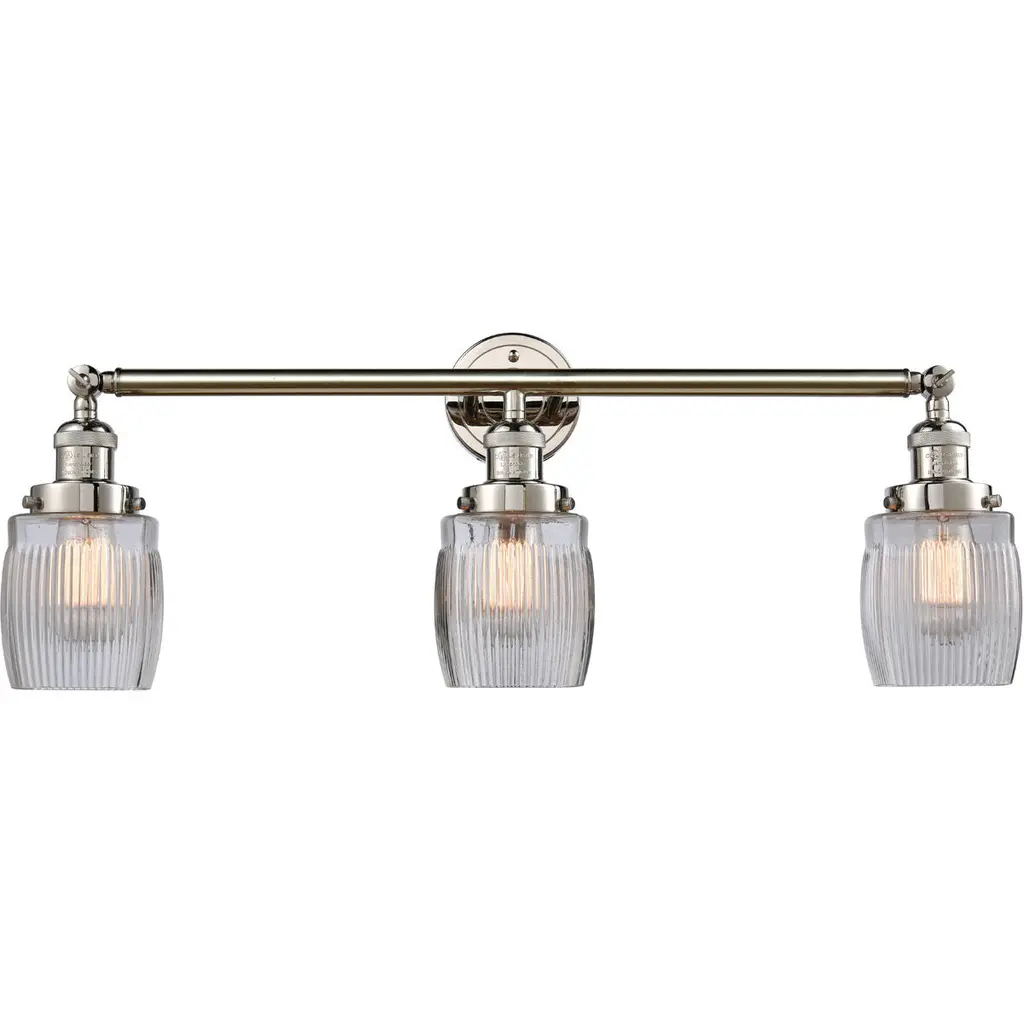 The Colton 3 Light Bath Vanity Light is part of the Franklin Restoration Collection. Solid Brass 180 Degree Adjustable Swivels with internal teeth that lock in at 5 degree intervals With Engraved Cast Cup