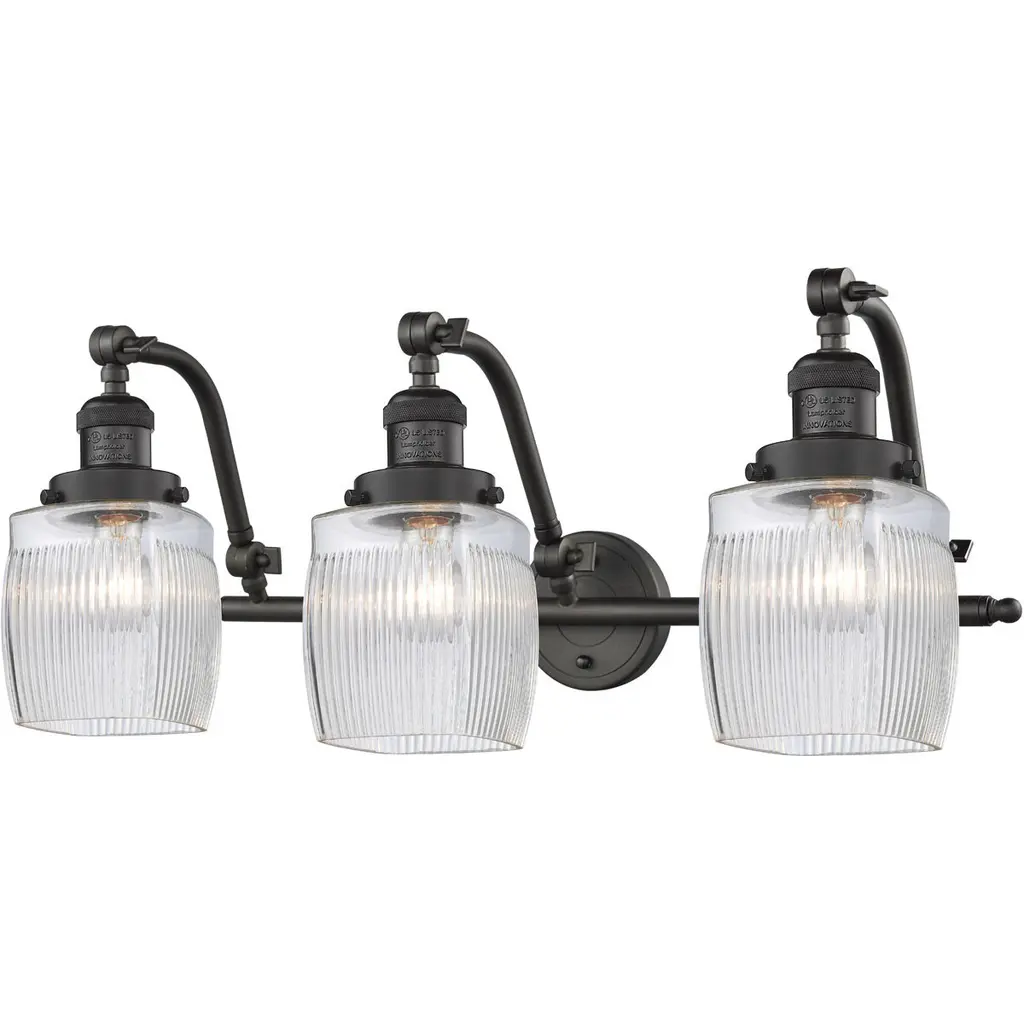 Franklin Restoration Halophane 3 Light 28 Inch Oil Rubbed Bronze Bath Vanity Light Wall Light In Clear Halophane Glass, Franklin Restoration