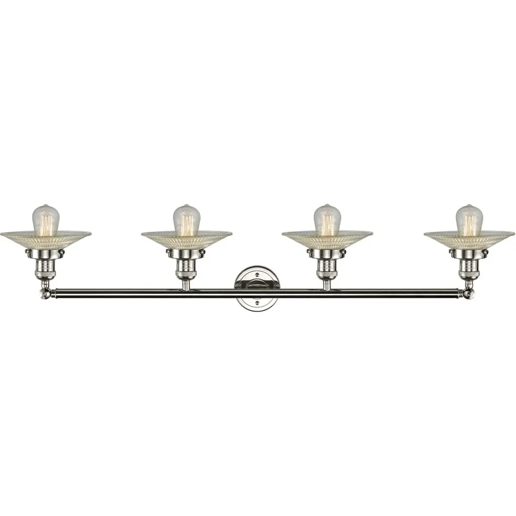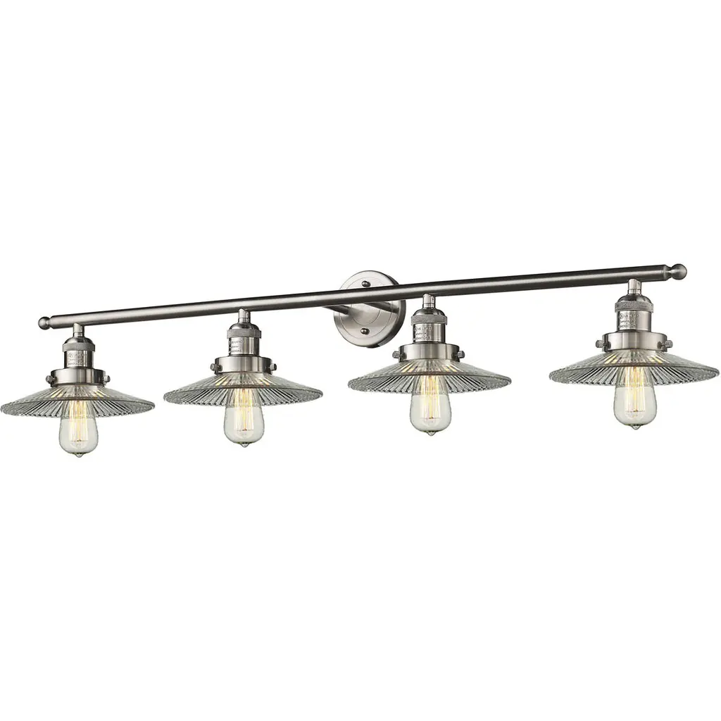 Franklin Restoration Halophane 4 Light 45 Inch Polished Nickel Bath Vanity Light Wall Light In Clear Halophane Glass, Franklin Restoration