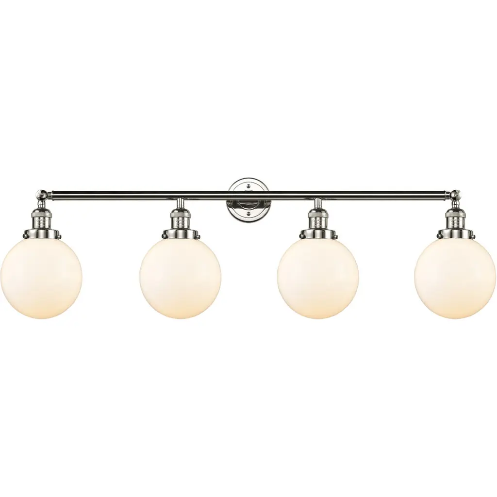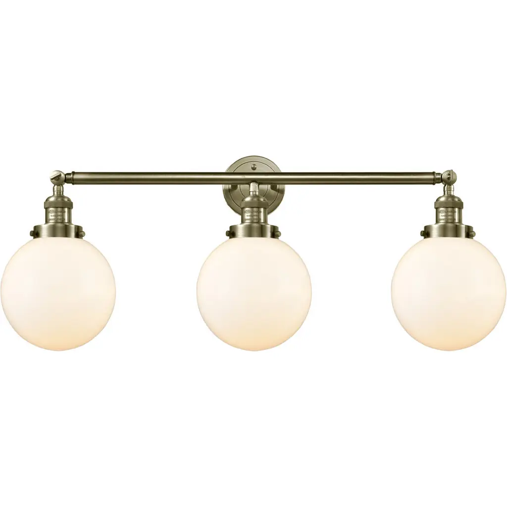 The Large Beacon 3 Light Bath Vanity Light is part of the Franklin Restoration Collection. Solid Brass 180 Degree Adjustable Swivels with internal teeth that lock in at 5 degree intervals With Engraved Cast Cup