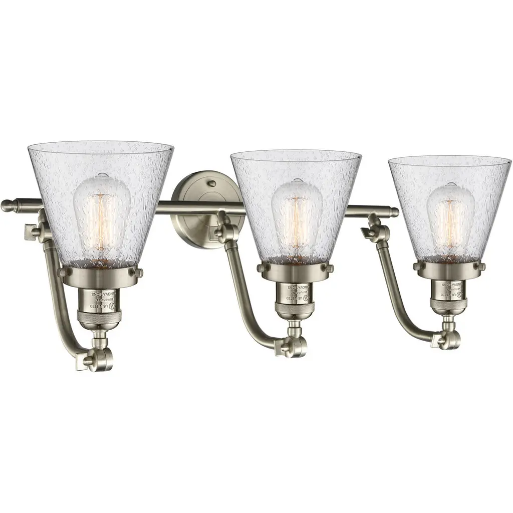 Franklin Restoration Small Cone 3 Light 28 Inch Brushed Satin Nickel Bath Vanity Light Wall Light In Seedy Glass, Franklin Restoration