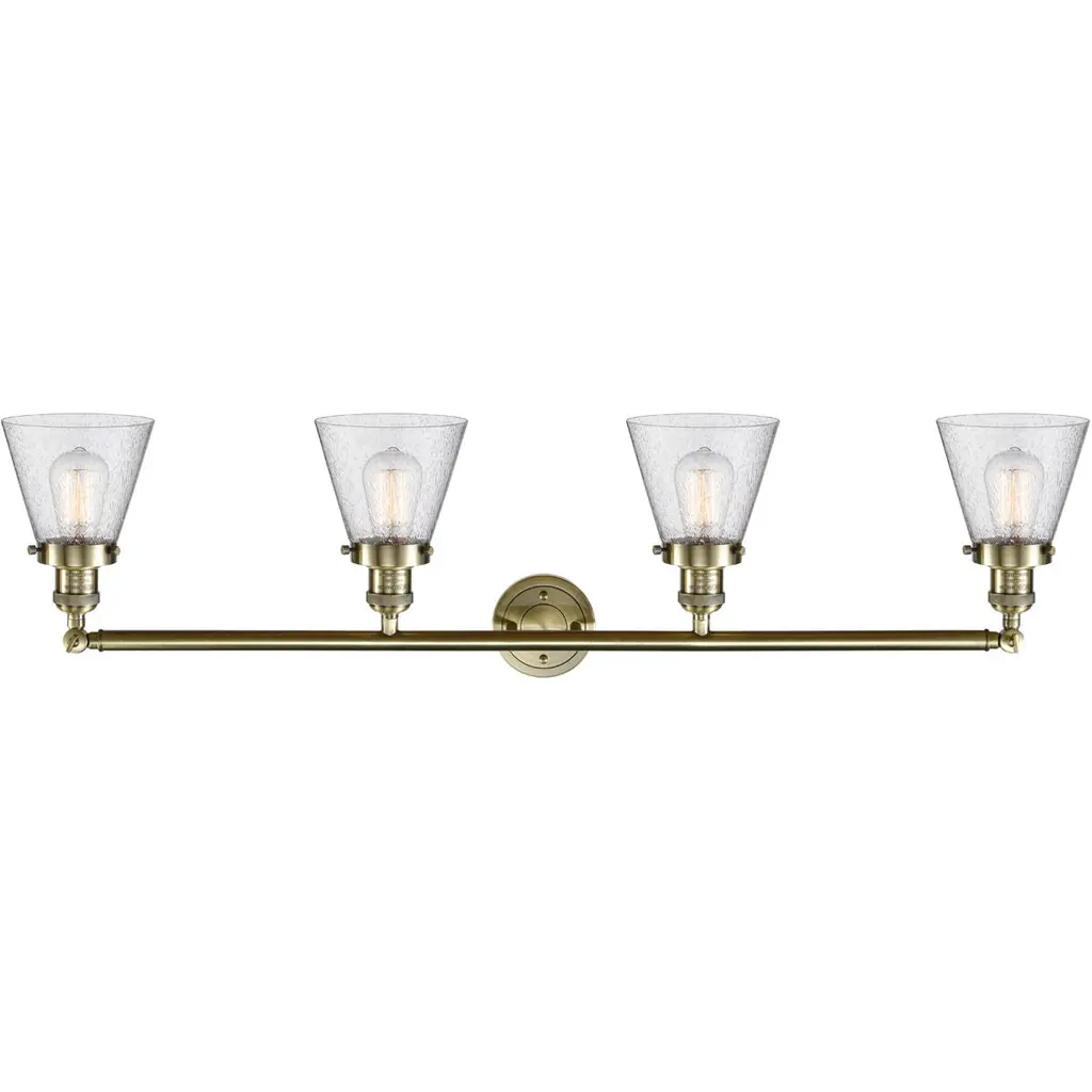 Franklin Restoration Small Cone 4 Light 42 Inch Antique Brass Bath Vanity Light Wall Light In Incandescent, Seedy Glass, Franklin Restoration
