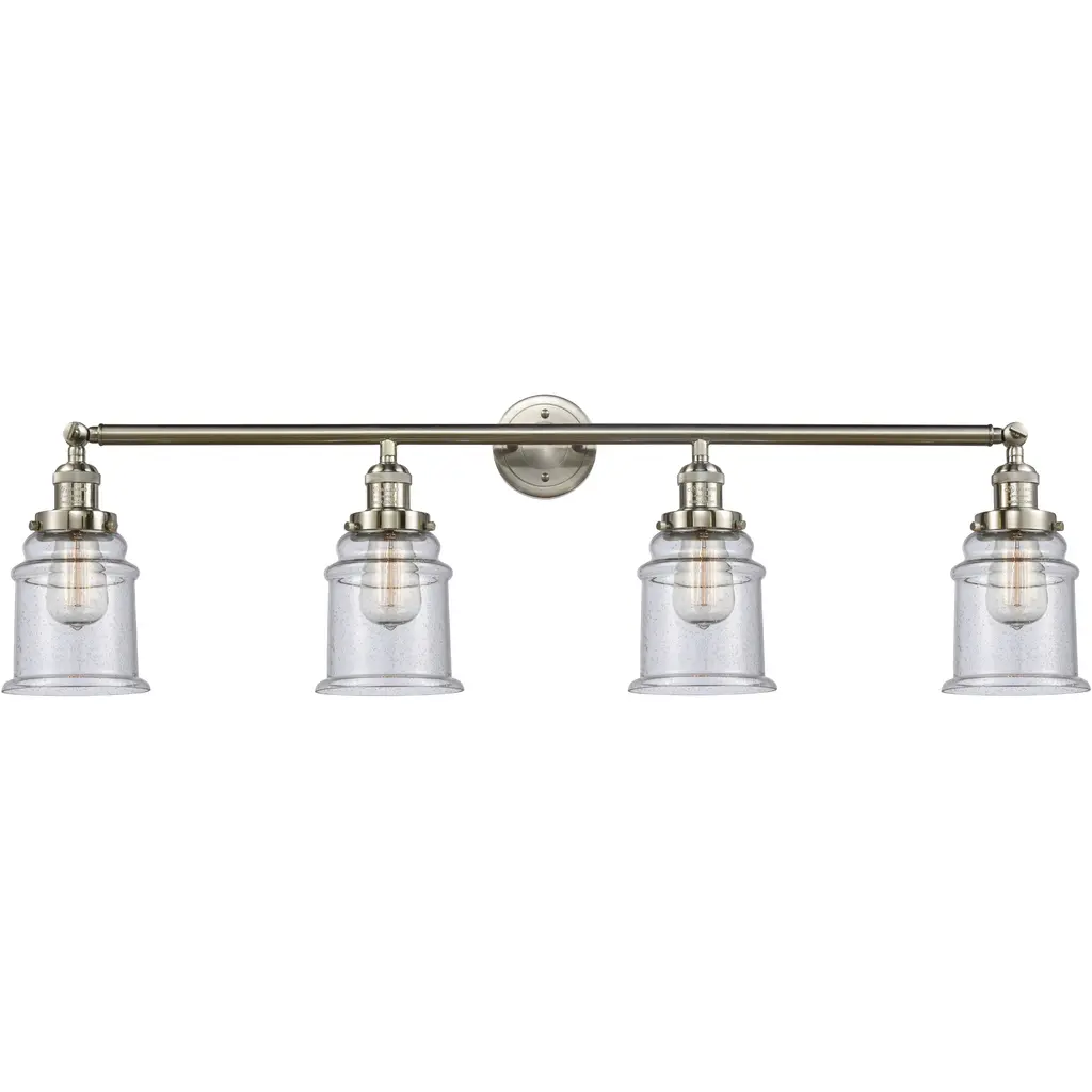 Franklin Restoration Small Cone 4 Light 42 Inch Brushed Satin Nickel Bath Vanity Light Wall Light In Seedy Glass, Franklin Restoration