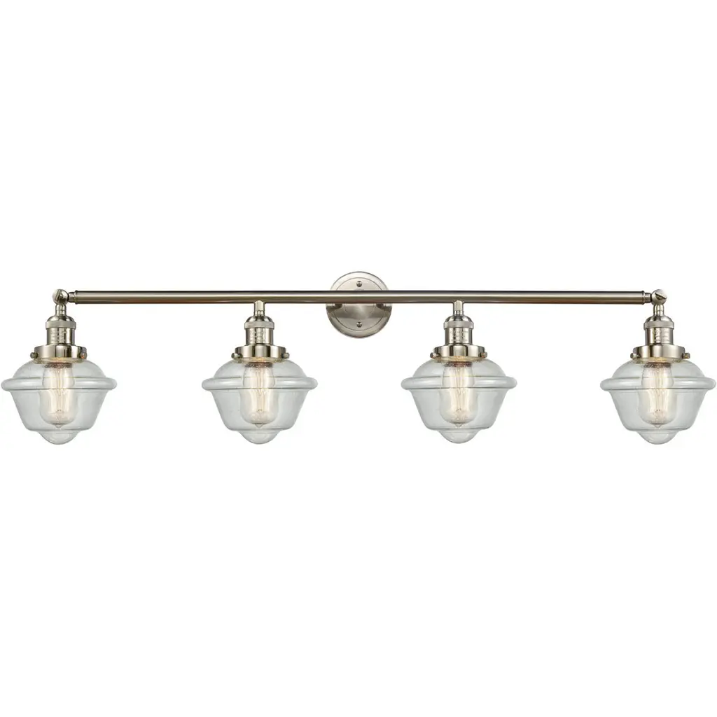 The Small Oxford 4 Light Bath Vanity Light is part of the Franklin Restoration Collection. Solid Brass 180 Degree Adjustable Swivels with internal teeth that lock in at 5 degree intervals With Engraved Cast Cup