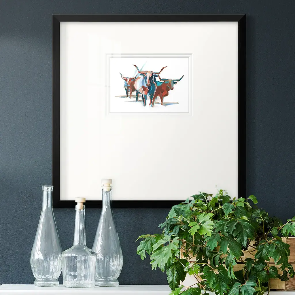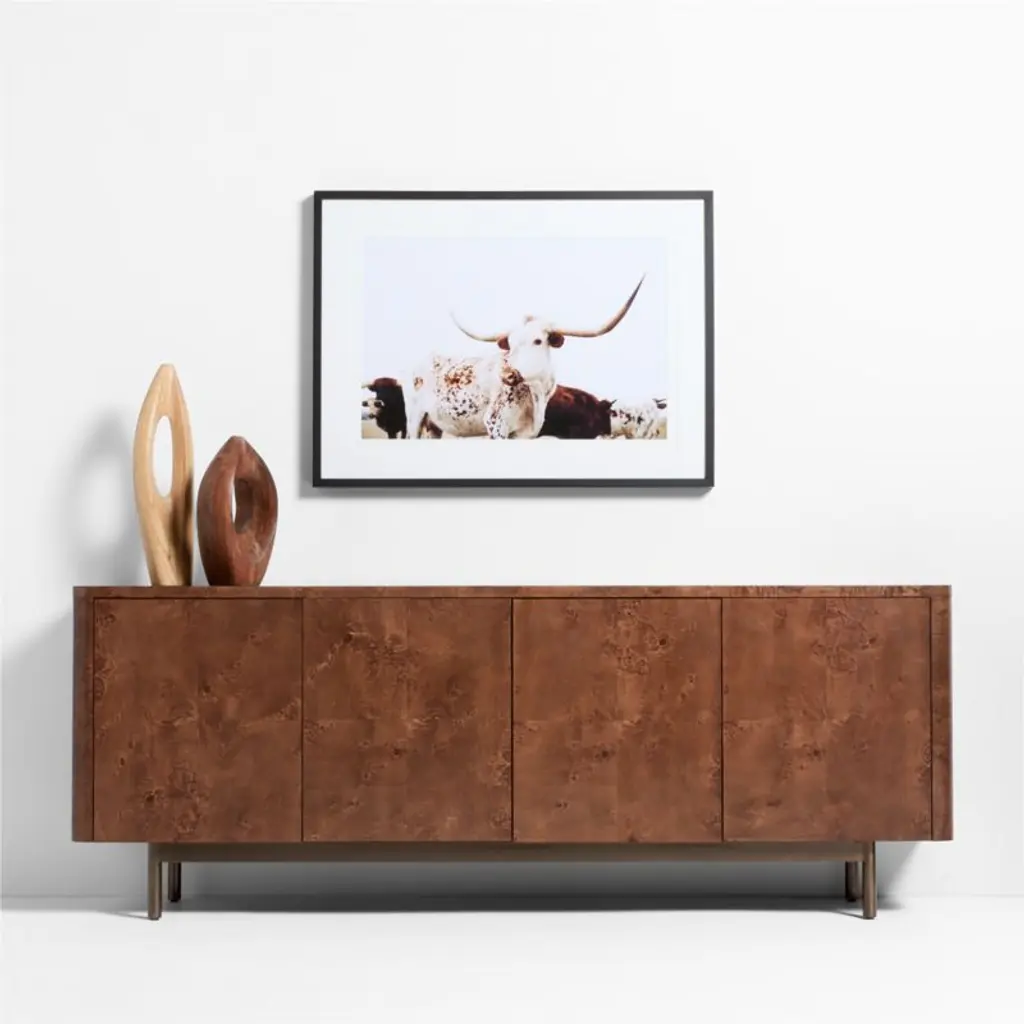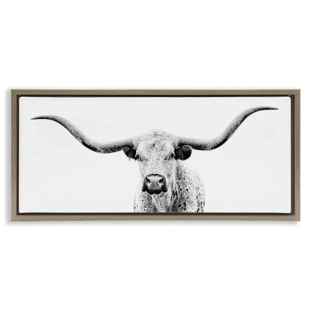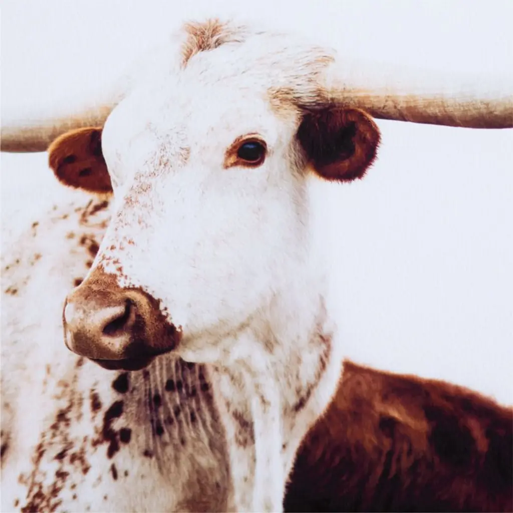 Photographer Addison Jones' striking portrait showcases a bull's distinctive constellation of freckles. The rich chestnut of his spots and ears visually link him to the other members of his herd, while the impressive spread of his horns frames the wide open sky. "Freckled Frank" is presented in a black frame that provides crisp contrast to the photograph's organic warmth.