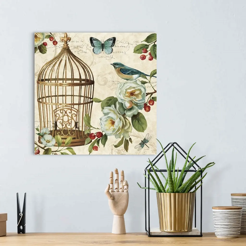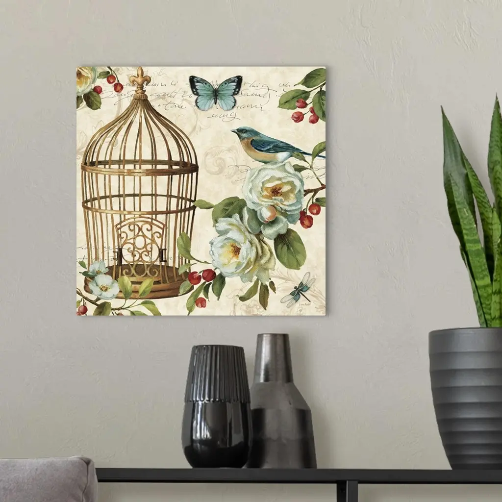 Contemporary artwork of a hanging gold birdcage surrounded by flowers and garden wildlife, against a cream patterned background.