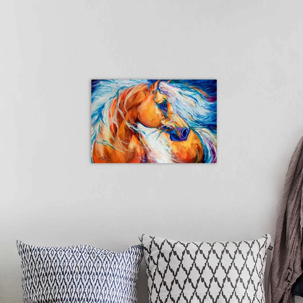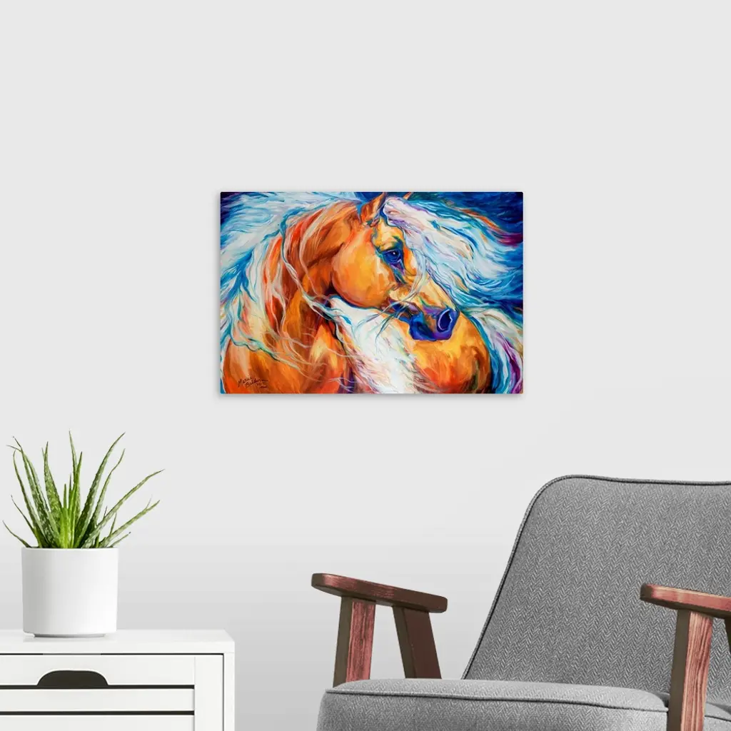 Abstract painting of a Palomino horse with a golden body and a white mane with blue and purple tones running through it.
