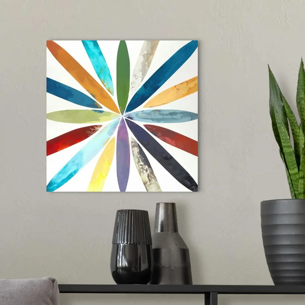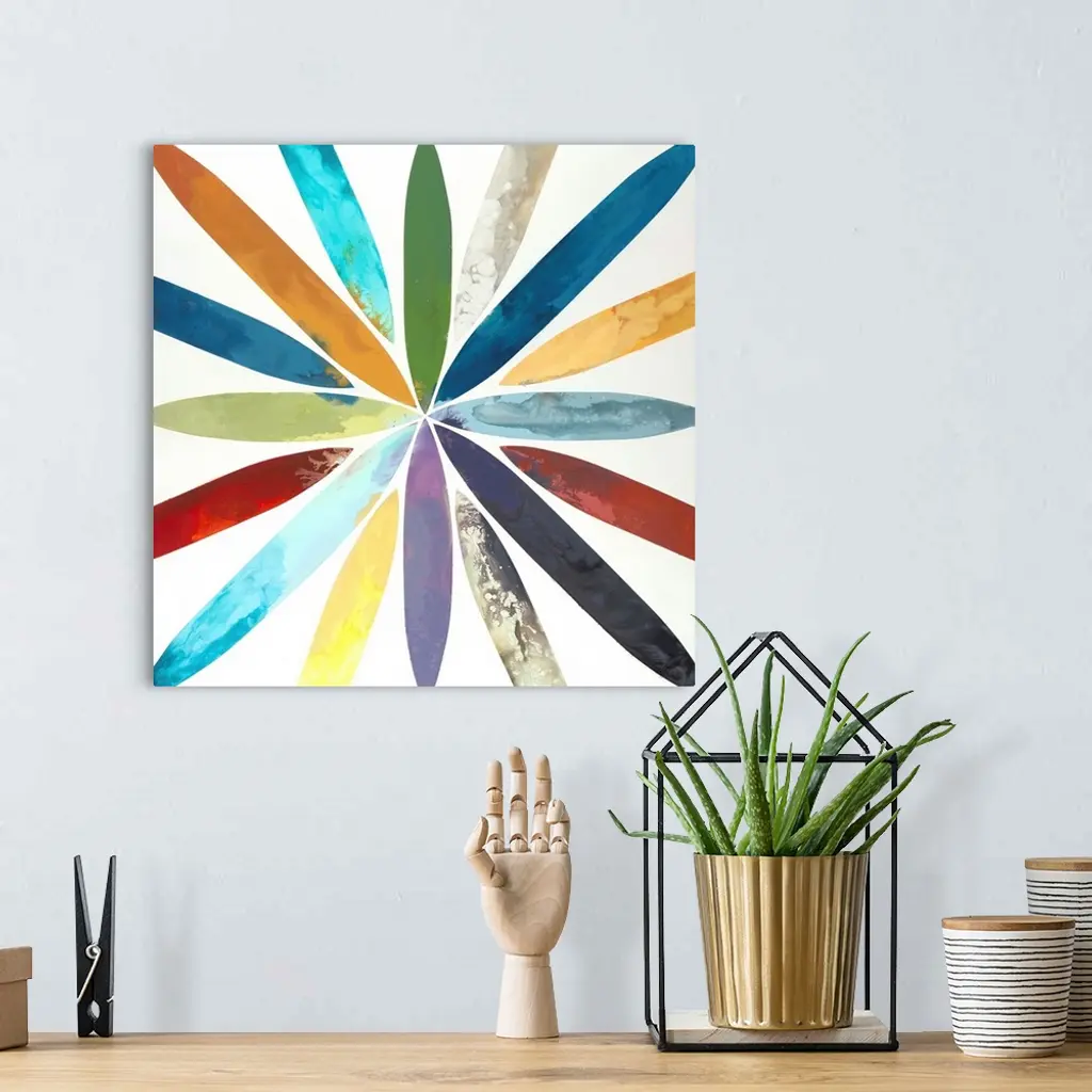 Square painting with colorful brushstrokes placed together in a circular formation resembling a flower.