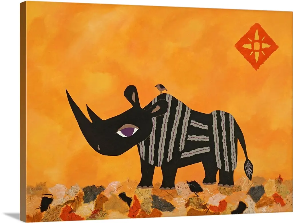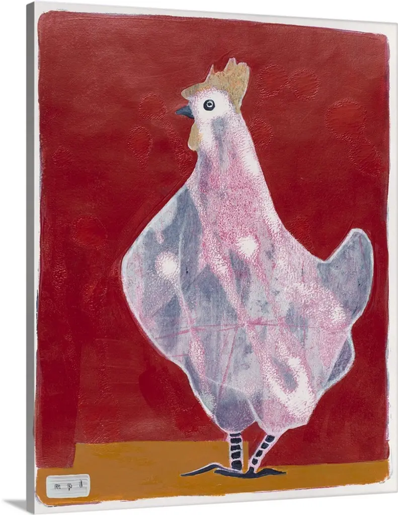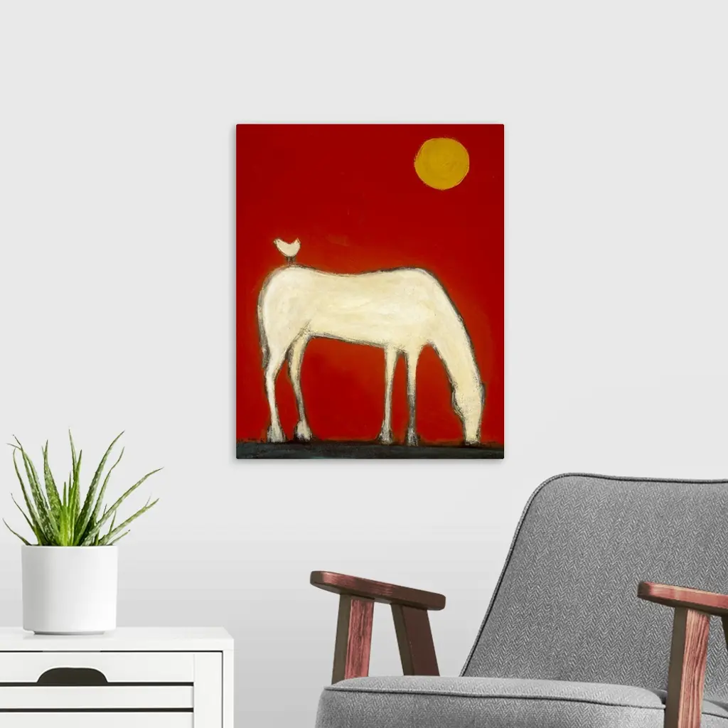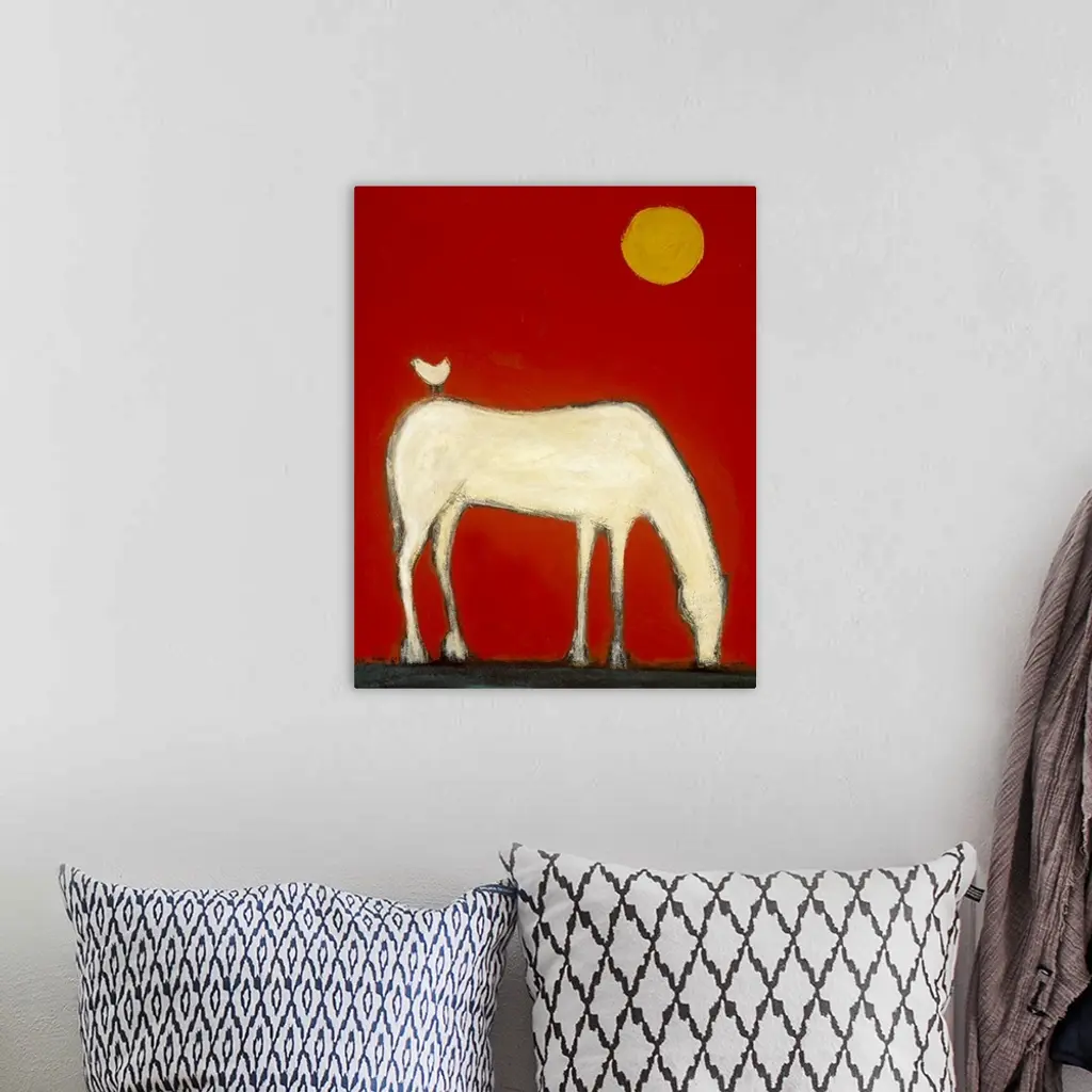 A large vertical contemporary painting of a white horse leaning over to eat with a small white bird standing on it's back.