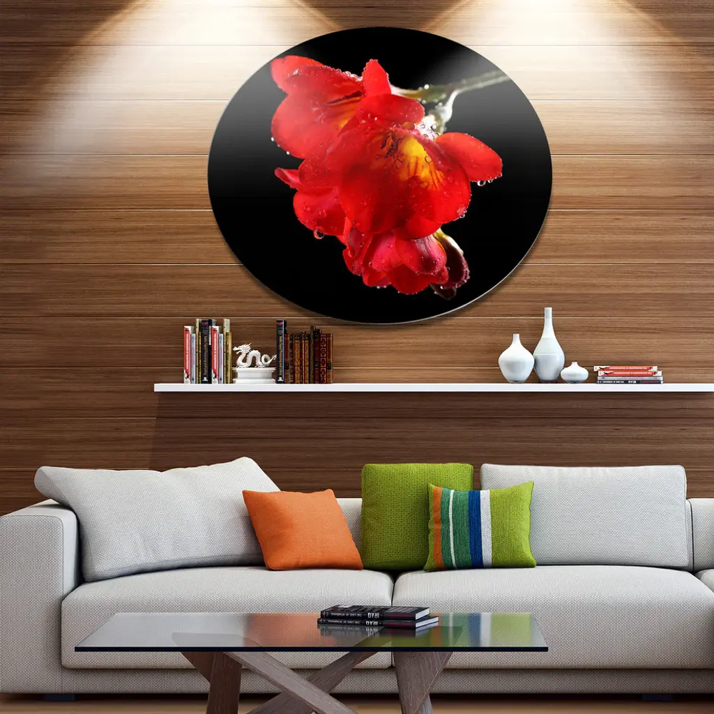 Bring Contemporary Abstraction to your home with this large Circle Metal wall art. This Freesia Flower on Black Background Metal Artwork makes it the focal point of any room or office. - White Gloss Coating ensures colors are extra vibrant with light reflection.- Aluminum grade Sheet Metal with 1 inch mounting frame on the back giving the illusion that the artwork is floating on the wall..- Mounting Brackets are included along with instructions.- High Quality Digital images are created directly into a glossy aluminum panel producing a stunning and captivating print into the glossy finish of the metal.- Water, Fire and Scratch resistant HD Aluminum panels.- Looks better than any photo paper and guaranteed to last at least 20 years- Easy to clean with a microfiber cloth. Colors are far superior to regular Canvas Art. - Easy to Hang
