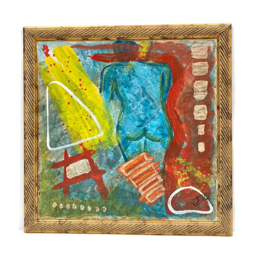 This bold and dynamic midcentury abstract painting bursts with color and energy, featuring vibrant swirls and dotted patterns. The piece conveys a sense of movement and excitement, with each brushstroke and splash of paint contributing to a complex, layered composition. Signed by the artist, this unique work is perfect for modern art enthusiasts.