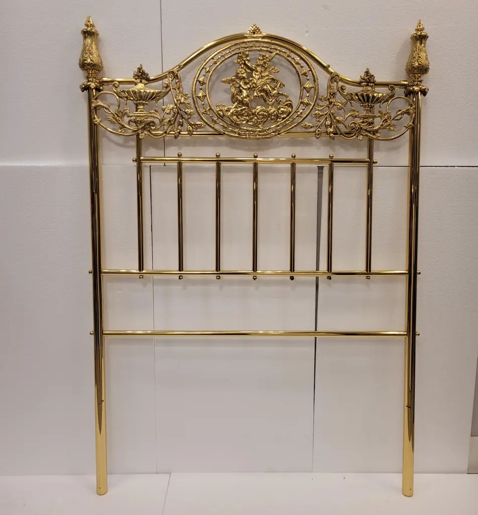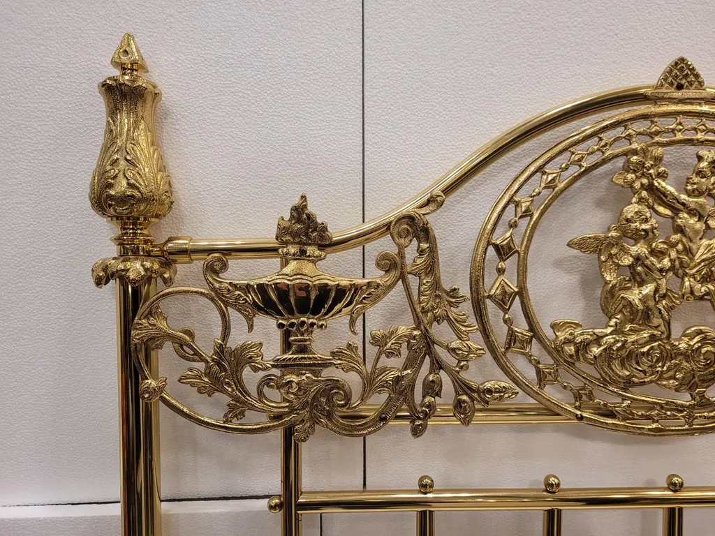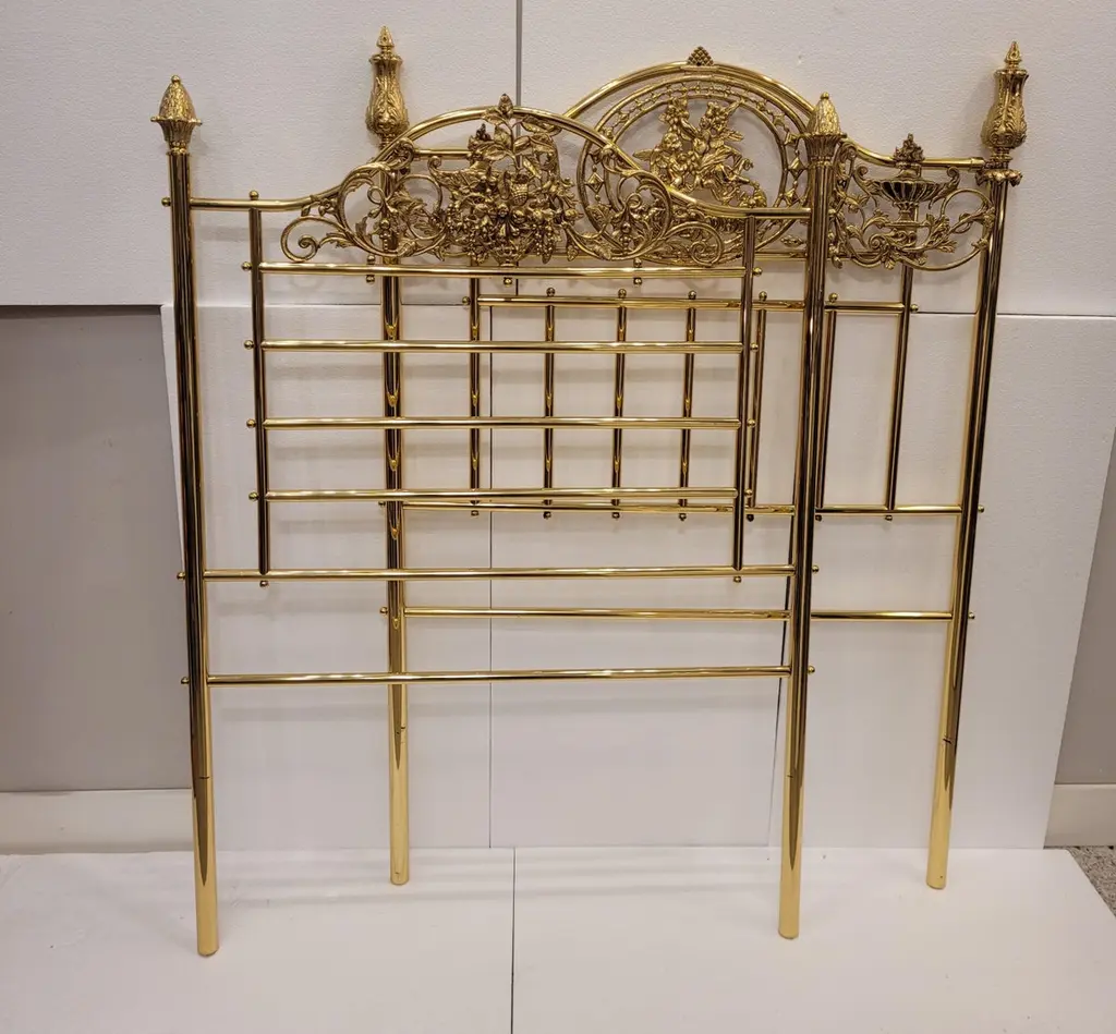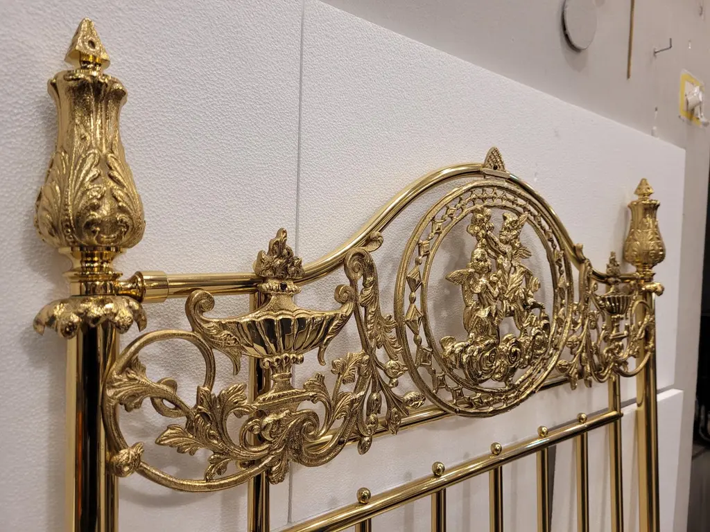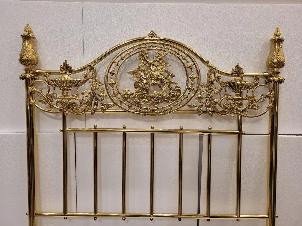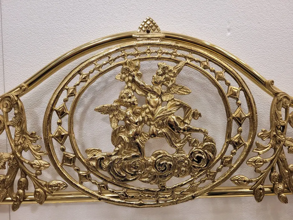 Beautiful French bed headboards in gilt bronze, Napoleon III.Measurements 140 cm tall and 134 cm the other, 7 cm wide and 95 cm wide both, they are headboards to hang on the wall, with small differences in the decorative motifs of the pilasters that flank the front, as well as in the finials, in pine cones on one and in vases on the other. front, one with a large central reserve that frames a scene of puttis among flowers, flanked by two large Medici cups and enriched by scrolls and seed beads. The other headboard has a beautiful floral and fruity composition on the front that stands out with the pineapples heading the pilasters.The gold is in very good condition, they are really exquisite and highly decorative, the idea is to hang them like a painting or frame on the wall and then add the mattress.With great visual cleanliness, they are easy to mix with other more contemporary styles, adding personality and refinement.