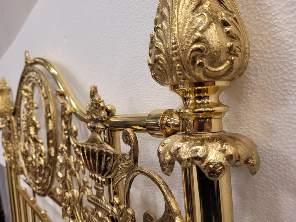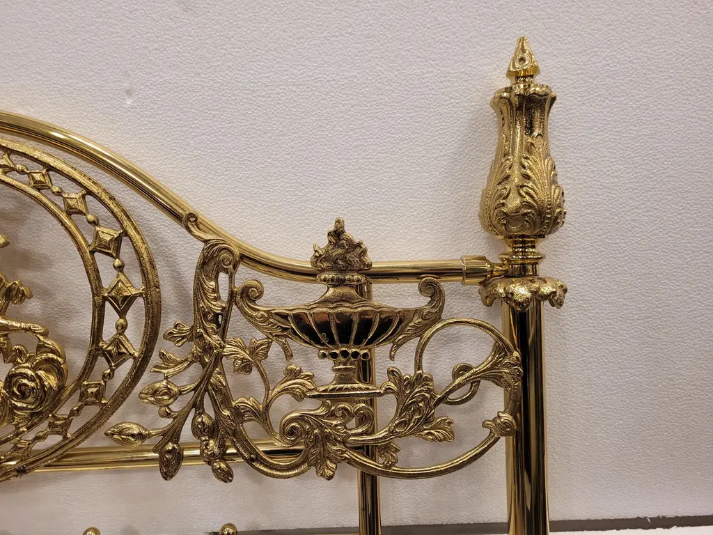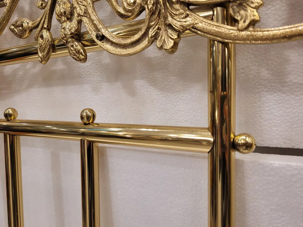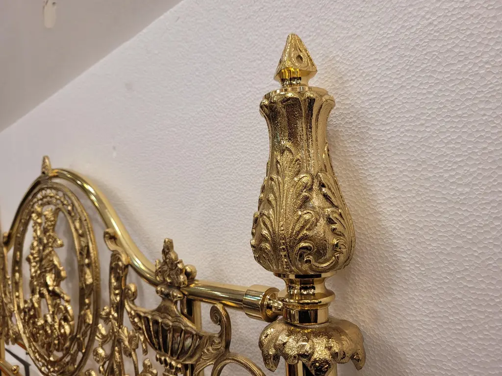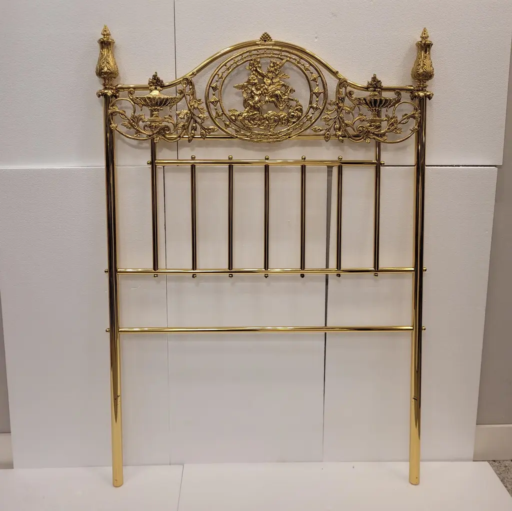Beautiful French bed headboards in gilt bronze, Napoleon III.Measurements 140 cm tall and 134 cm the other, 7 cm wide and 95 cm wide both, they are headboards to hang on the wall, with small differences in the decorative motifs of the pilasters that flank the front, as well as in the finials, in pine cones on one and in vases on the other. front, one with a large central reserve that frames a scene of puttis among flowers, flanked by two large Medici cups and enriched by scrolls and seed beads. The other headboard has a beautiful floral and fruity composition on the front that stands out with the pineapples heading the pilasters.The gold is in very good condition, they are really exquisite and highly decorative, the idea is to hang them like a painting or frame on the wall and then add the mattress.With great visual cleanliness, they are easy to mix with other more contemporary styles, adding personality and refinement.