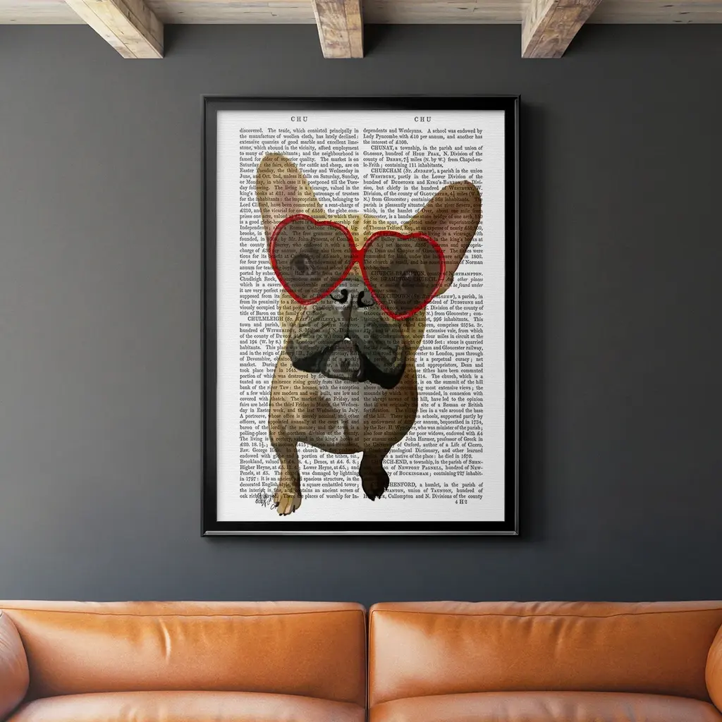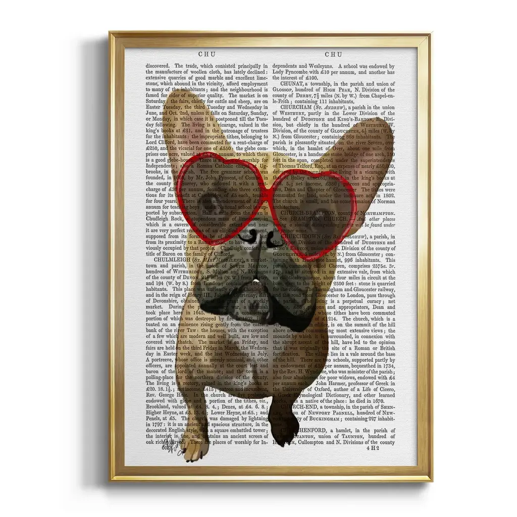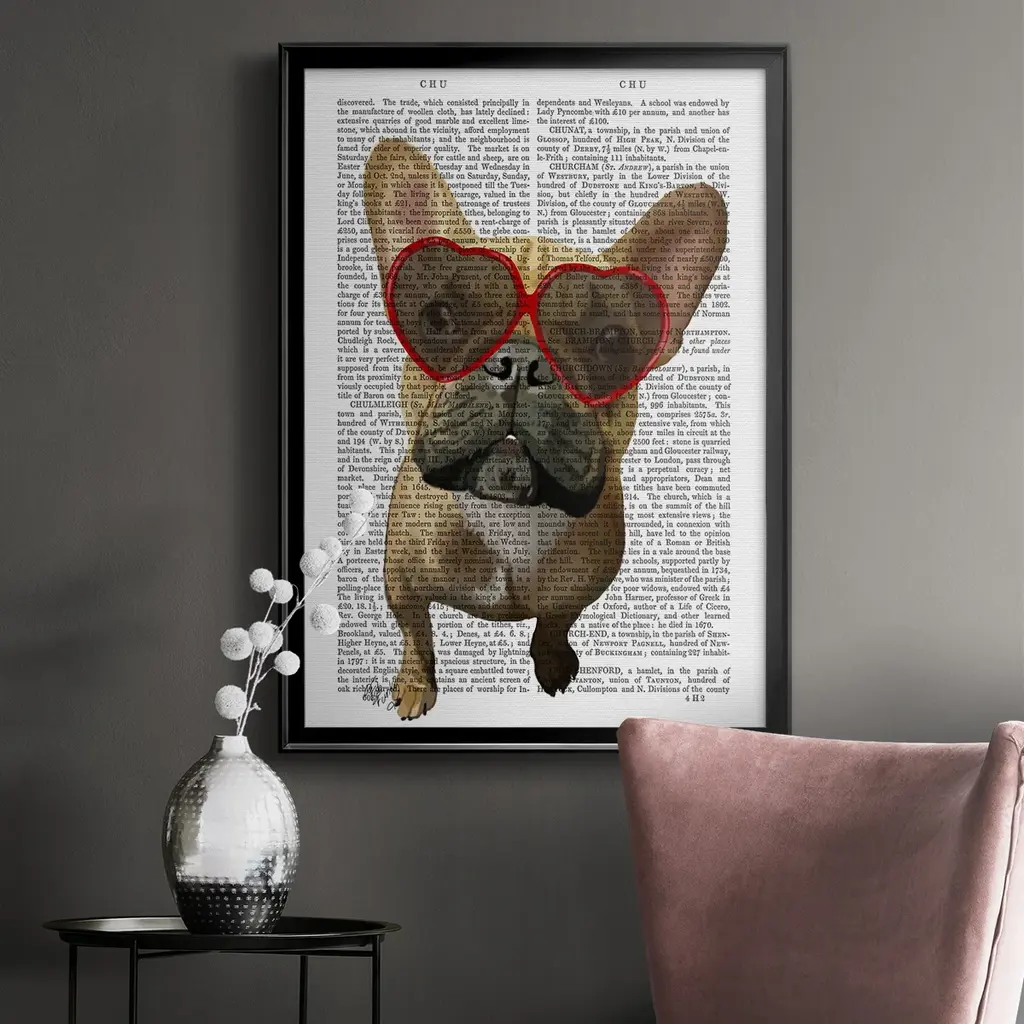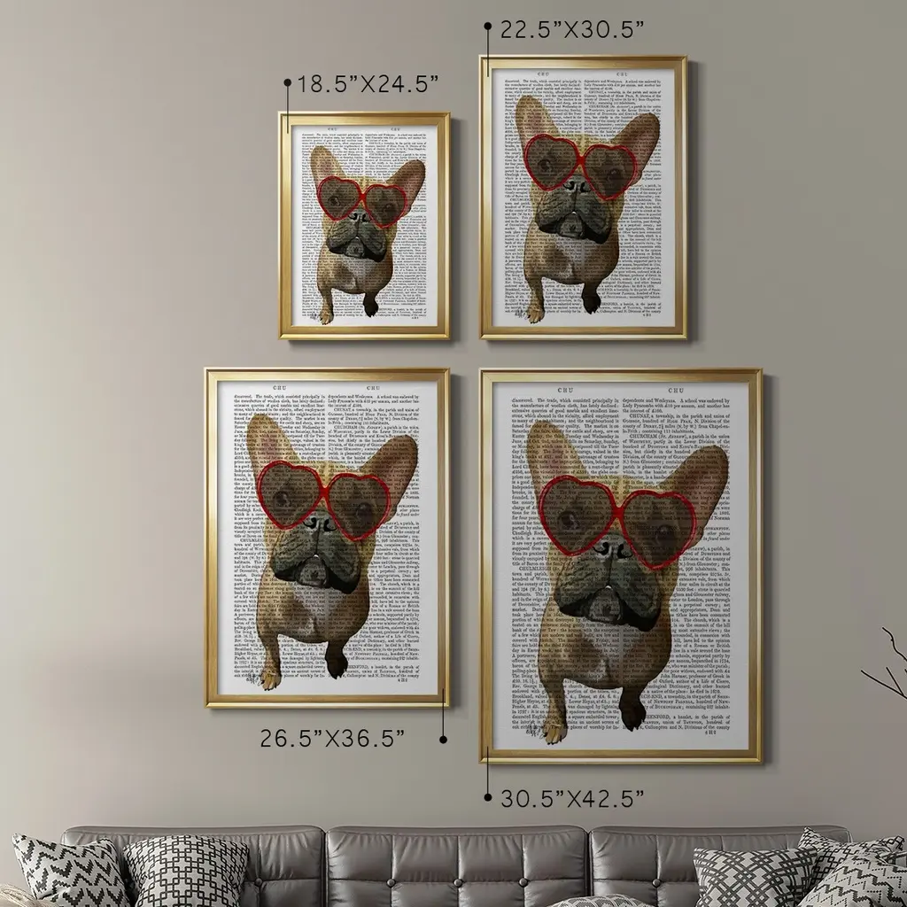 French Bulldog and Heart Glasses Premium Framed Print - Ready to Hang A Premium Framed Print created to last. Framed in distressed wood and available in an array of sizes and colors Featuring a beveled a solid wood stretcher bar, each piece comes ready to hand 4 SIZES AVAILABLE 30.5''X42.5'' - Overall Size 26.5'X36.5'' - Overall Size 22.5''x30.5'' - Overall Size 18.5''x24.5'' - Overall Size Each piece is made to order. Each piece comes with hanging hardware. Made in the USA Ready to Hang