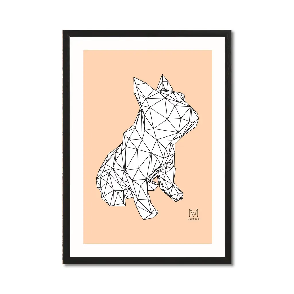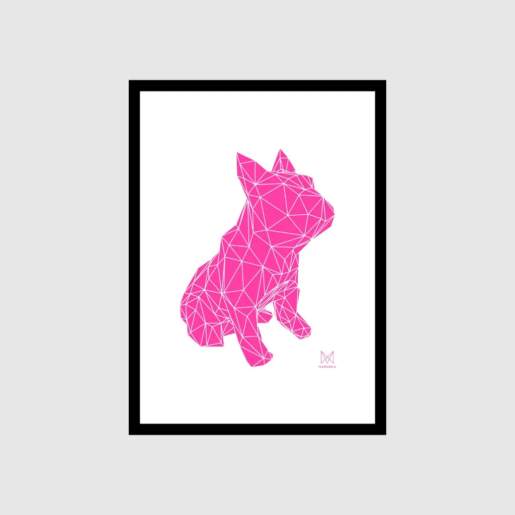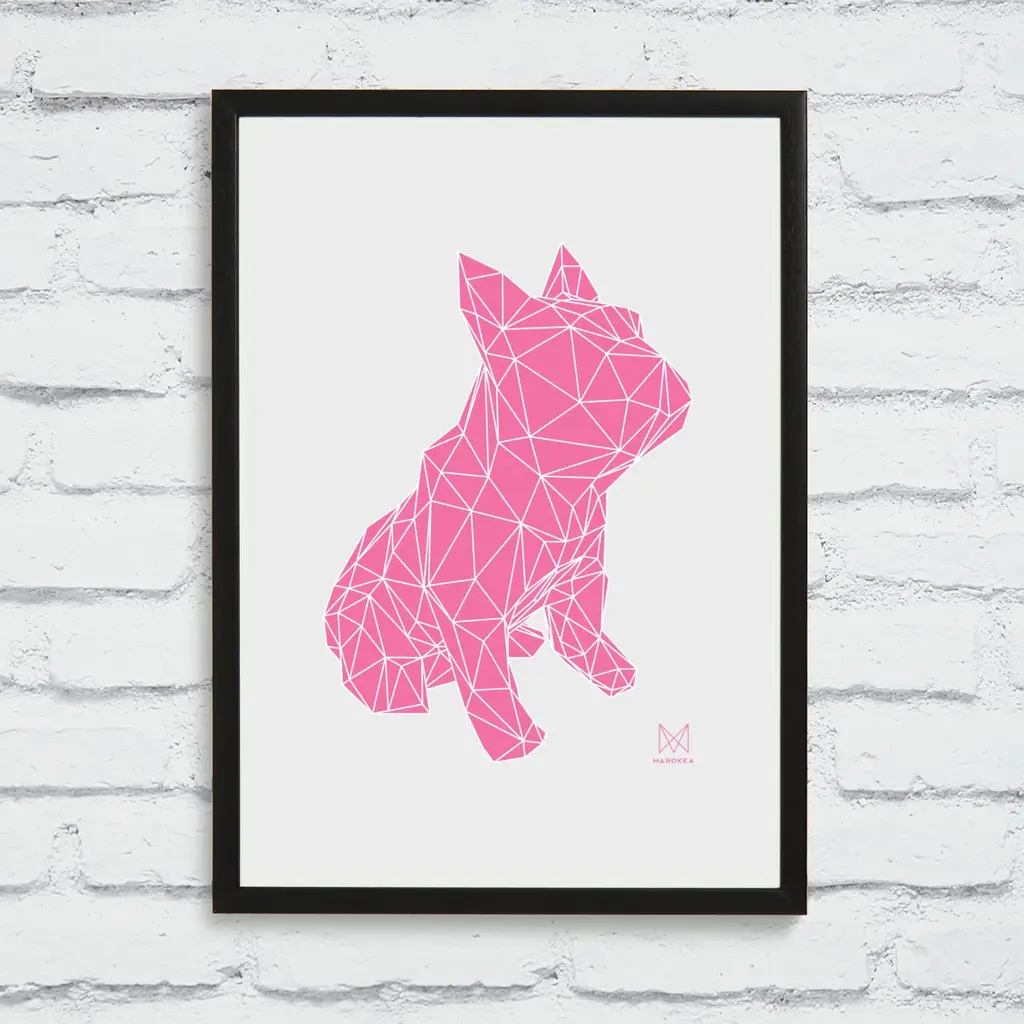 The striking wire frame image of FRANK the French Bulldog, in pink on a plain background. Marokka screen prints are hand printed in London on beautifully pristine white 300gsm Italian Fabriano 5 paper. Prints are individually numbered and each colour/style is limited to an edition of 50.Our frames come with a 2cm stained black shallow wooden border, and are framed with acrylic "glass" to avoid breakages in transit. Glazing1.5mm Clarity+ Acrylic. Although this material is more expensive than glass, it's used in your frame because it offers superior UV protection, is far safer and is beautifully clear.