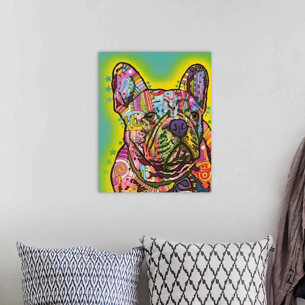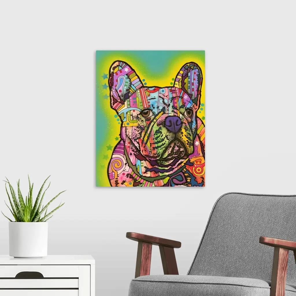 Colorful painting of a French Bulldog with abstract markings on a teal background with a yellow and lime green outline, stars, and paint splatter.
