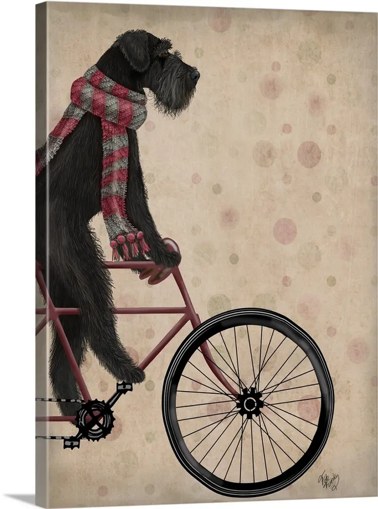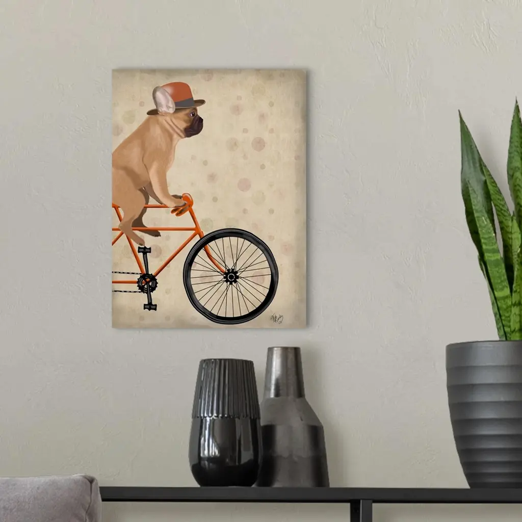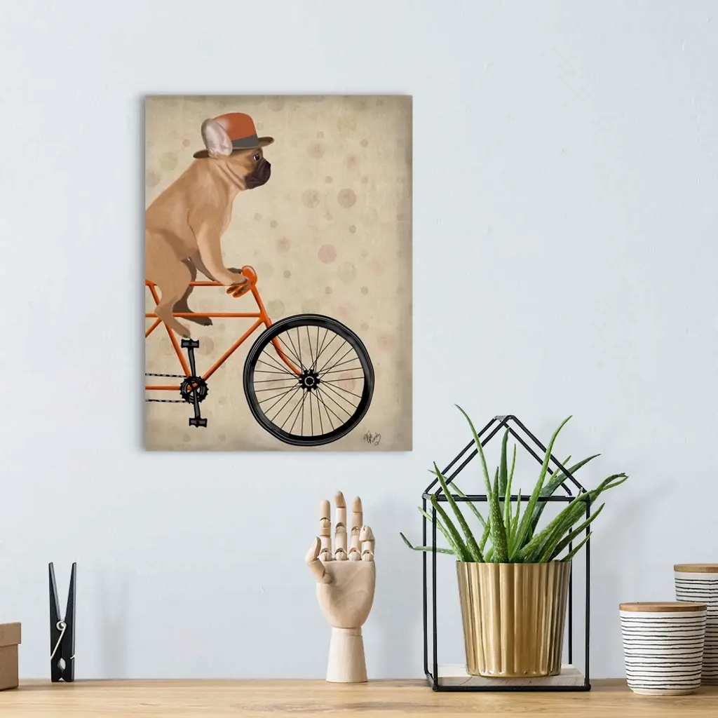 Decorative artwork of a French Bulldog riding on an orange bicycle and wearing an orange top hat.