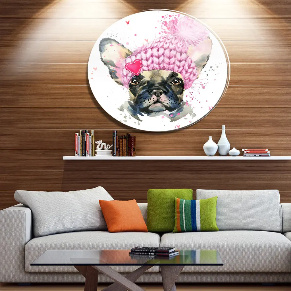 Bring Contemporary Abstraction to your home with this large Circle Metal wall art. This French Bulldog with Pink Hat Metal Artwork makes it the focal point of any room or office. - White Gloss Coating ensures colors are extra vibrant with light reflection.- Aluminum grade Sheet Metal with 1 inch mounting frame on the back giving the illusion that the artwork is floating on the wall..- Mounting Brackets are included along with instructions.- High Quality Digital images are created directly into a glossy aluminum panel producing a stunning and captivating print into the glossy finish of the metal.- Water, Fire and Scratch resistant HD Aluminum panels.- Looks better than any photo paper and guaranteed to last at least 20 years- Easy to clean with a microfiber cloth. Colors are far superior to regular Canvas Art. - Easy to Hang