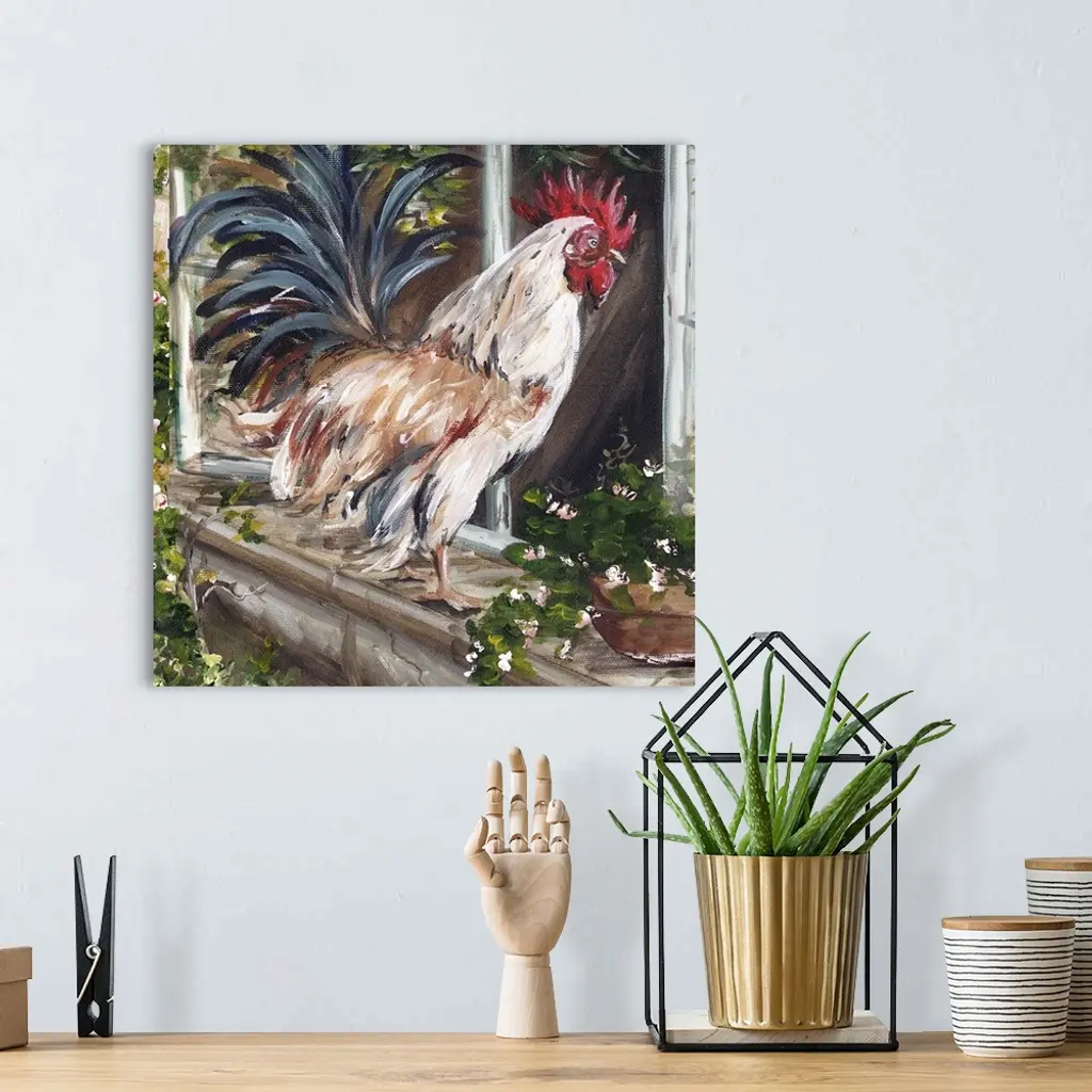 Square contemporary painting in a traditional style of a white and brown rooster perched on a window sill.