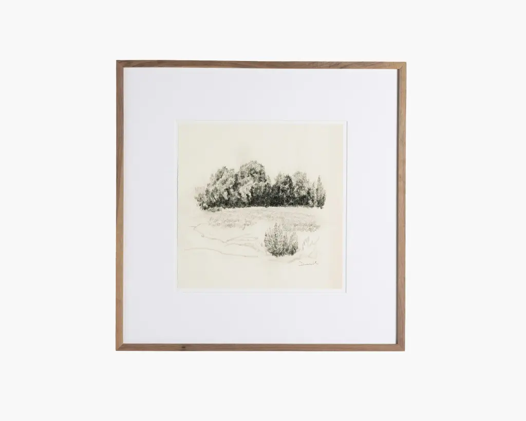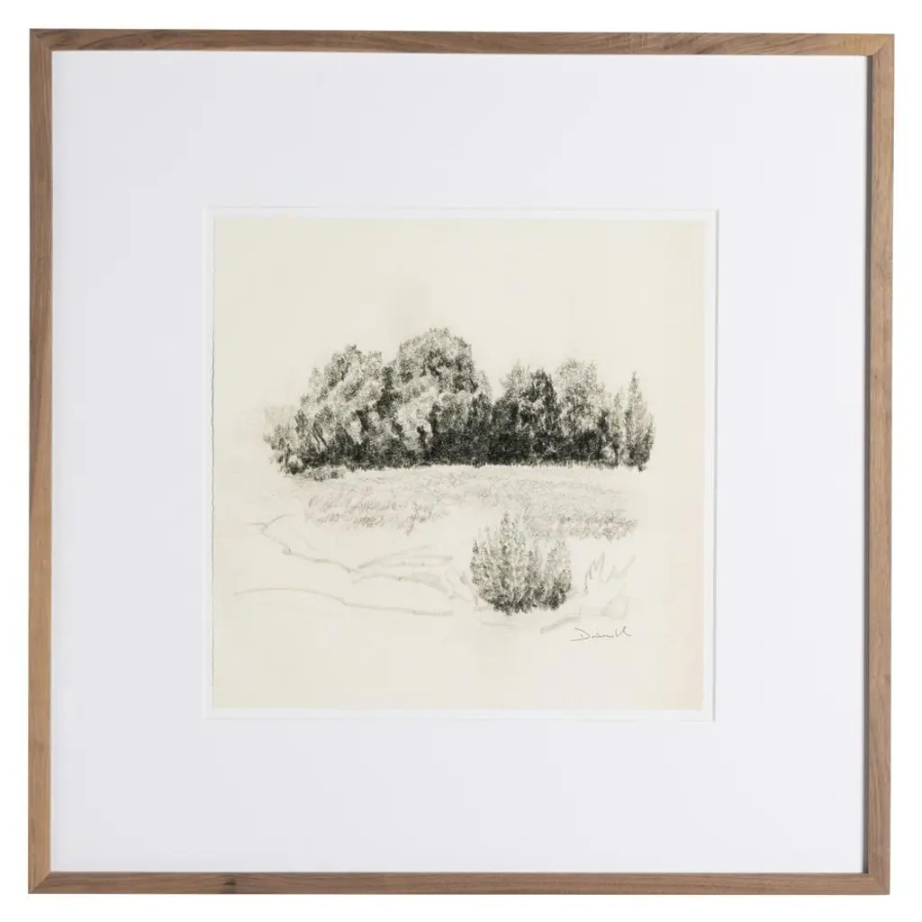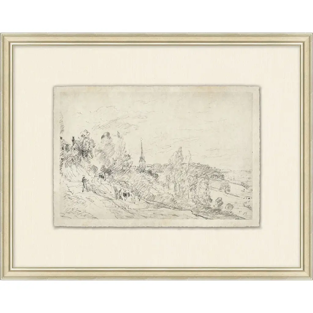 With a subtle composition, French Countryside III is inviting and intricate. The sketch depicts an expanse in nature before a quaint town, with intricate linework. Deckled and floated on a mat, the piece is framed by silver-finished wood.