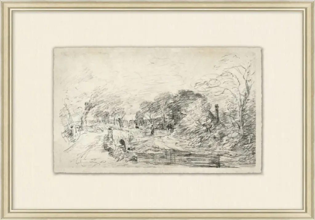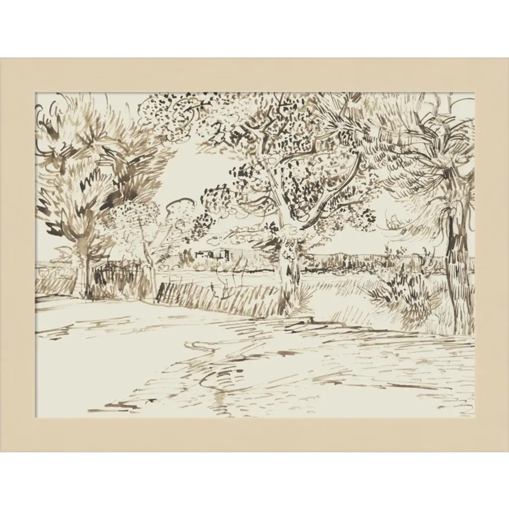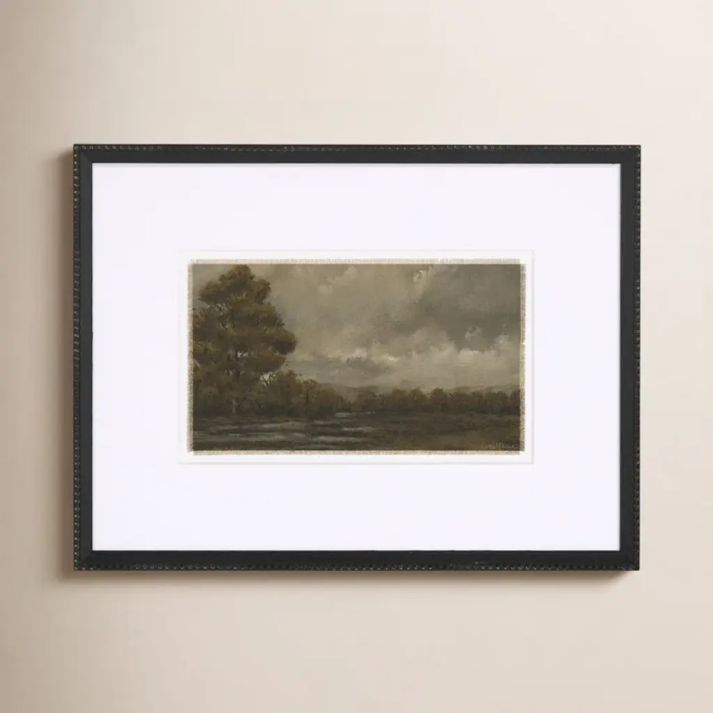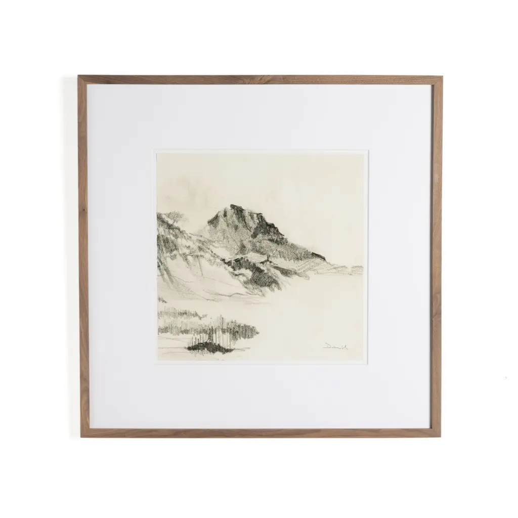 With a subtle composition, French Countryside III is inviting and intricate. The sketch depicts an expanse in nature before a quaint town, with intricate linework. Deckled and floated on a mat, the piece is framed by silver-finished wood.