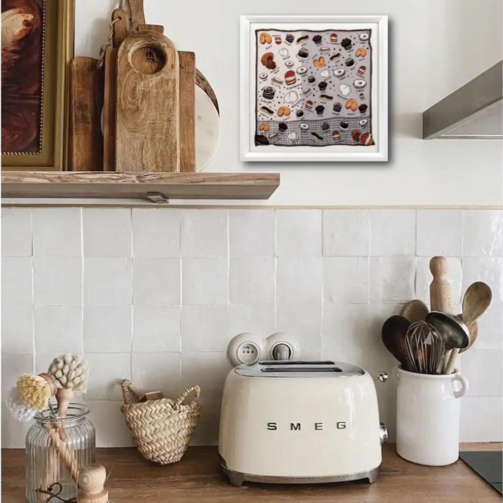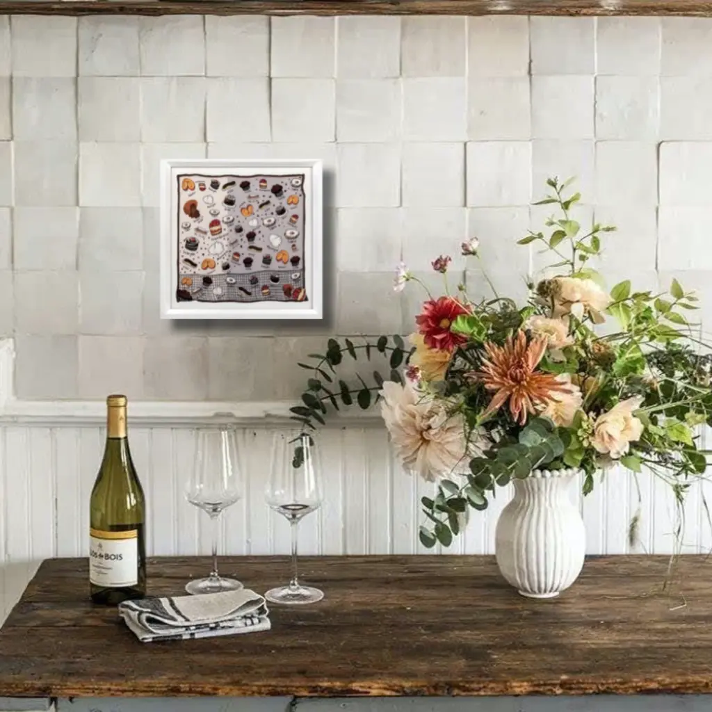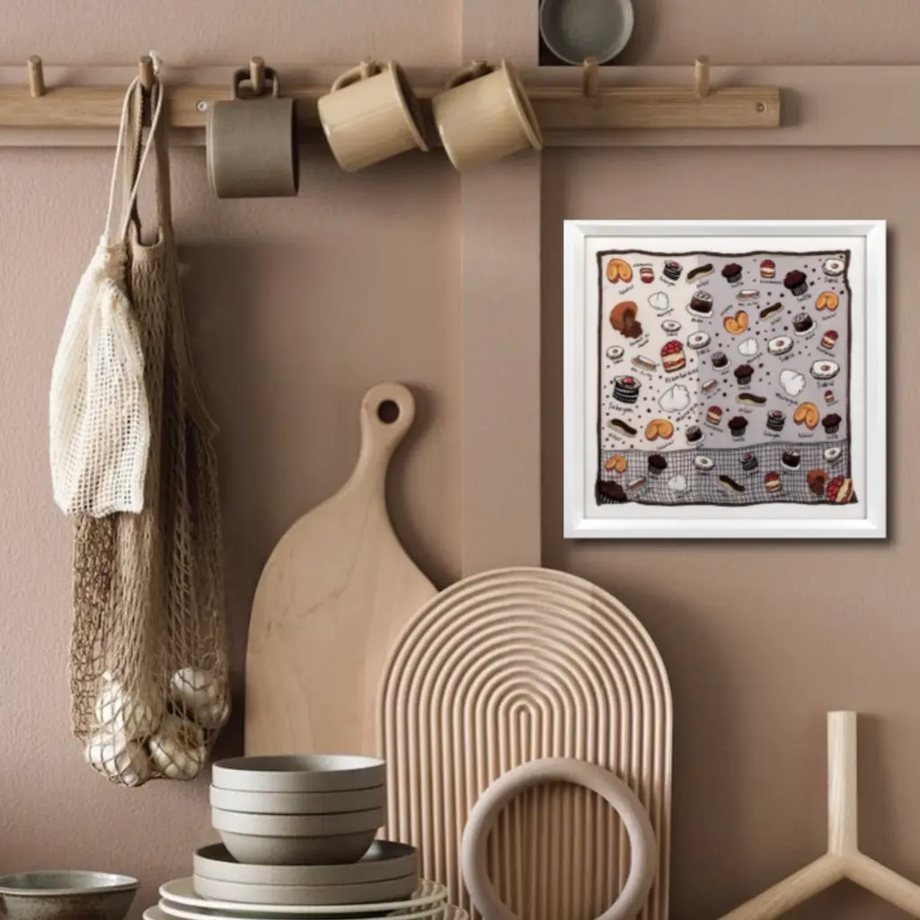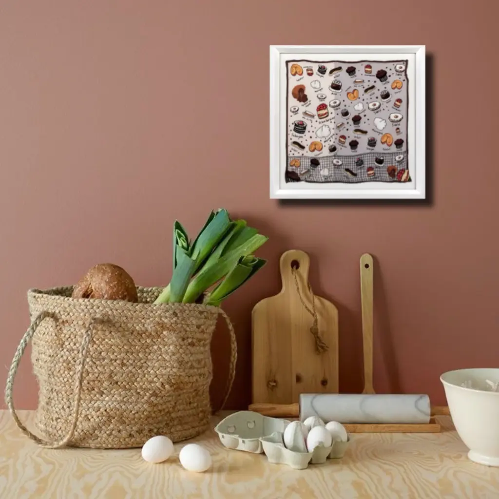 Inspired by the charm of French pâtisserie, this collection features illustrated versions of France’s most beloved desserts. From macarons and éclairs to tartelettes and crème brûlée, each piece celebrates the elegance and sweetness of French culinary tradition.The paintings consist of special designs drawn by painters with a passion for art and travel.Color your Home with Art with Un Poco!· Our patterns are hand drawn and digitally printed.· 100% silk scarf with 100% wooden frame.· The edges of our scarves are sewn by hand.